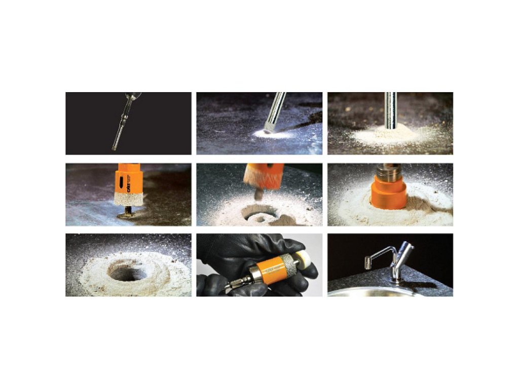 • Dokonale kulaté tělo korunky.• Diamantové tenké břity s dlouhou životností.• Speciální boční otvory.• Rychlá a snadná výměna středícího vrtáku.DIAMANTOVÝ POVLAK (ZRNO) PRVOTŘÍDNÍ KVALITYSkvěle tvarované a extrémně silné teplovzdorné krystaly bez příměsí, které zajišťují rychlé čisté řezy a až 10x delší životnost. Běžnými vrtacími korunkami se do extrémně tvrdých materiálů obtížně vrtá, a proto byly vyvinuty speciálně pro profesionály diamantové vrtací korunky s povlakem po celém obvodu. Tyto korunky zaručují vynikající výkon a dlouhou životnost i při vrtání v těch nejtvrdších materiálech. SYSTÉM FASTX4: REVOLUCE VE VRTÁNÍ OTVORŮ!Inovativní systém CMT nabízí velké výhody všem profesionálům.X1 RYCHLÉ UPNUTÍ - VŠE NA JEDNO CVAKNUTÍ!Vyvinuli jsme jedinečný patentovaný Fast Lock systém pro rychlou výměnu mezi velikostmi a typy během několika vteřin!Jediný systém, který umožňuje vyměnit vrtací korunku a středící vrták bez použití jakýchkoli nástrojů.X2 RYCHLÉ VRTÁNÍ - RYCHLÉ VRTÁNÍ V KAŽDÝCH PODMÍNKÁCH.Vrtejte rychle a přesně i pod úhlem pomocí jedinečné geometrie těla a skvěle naostřeným zubům.• předvrtejte otvor pod požadovaným úhlem• nasaďte korunku zpět do přední polohy a dokončete vyvrtání otvoruX3 RYCHLÉ ZVĚTŠENÍ OTVORU - JEDINEČNÉ ŘEŠENÍ PRO ZVĚTŠENÍ OTVORU!CMT přichází s unikátním rychlým zvětšením otvoru. Na speciální vrták můžete nasadit 2 korunky, a vyvrtat tak širší otvor během několika vteřin.X4 JEDNODUCHÉ VYJMUTÍ ZÁTKY - SNADNO VYJMĚTE ZÁTKU Z KORUNKY JEDNÍM STISKNUTÍM!Už žádné šroubováky nebo jiné nástroje!Zátku bez námahy vyjměte obrácením středícího vrtáku.Materiály:• dlaždice (keramické, gresové, apod.)• tvrdý kámen (žula, mramor, apod.)• umělý kámen (Okite®, Silestone®, apod.)Parametry:• Celková délka: 45 mm• Řezná hloubka: 35 mm• Doporučené otáčky: 1500 - 4000 ot./min.• Příklep mějte při použití korunkových vrtáků vždy vypnutý.• Doporučujeme použít vysokorychlostní vrtačku (min. 14V).• Pro dosažení nejlepšího výsledku vždy předvrtávejte středícím vrtákem, středící vrták snižuje riziko skluzu.