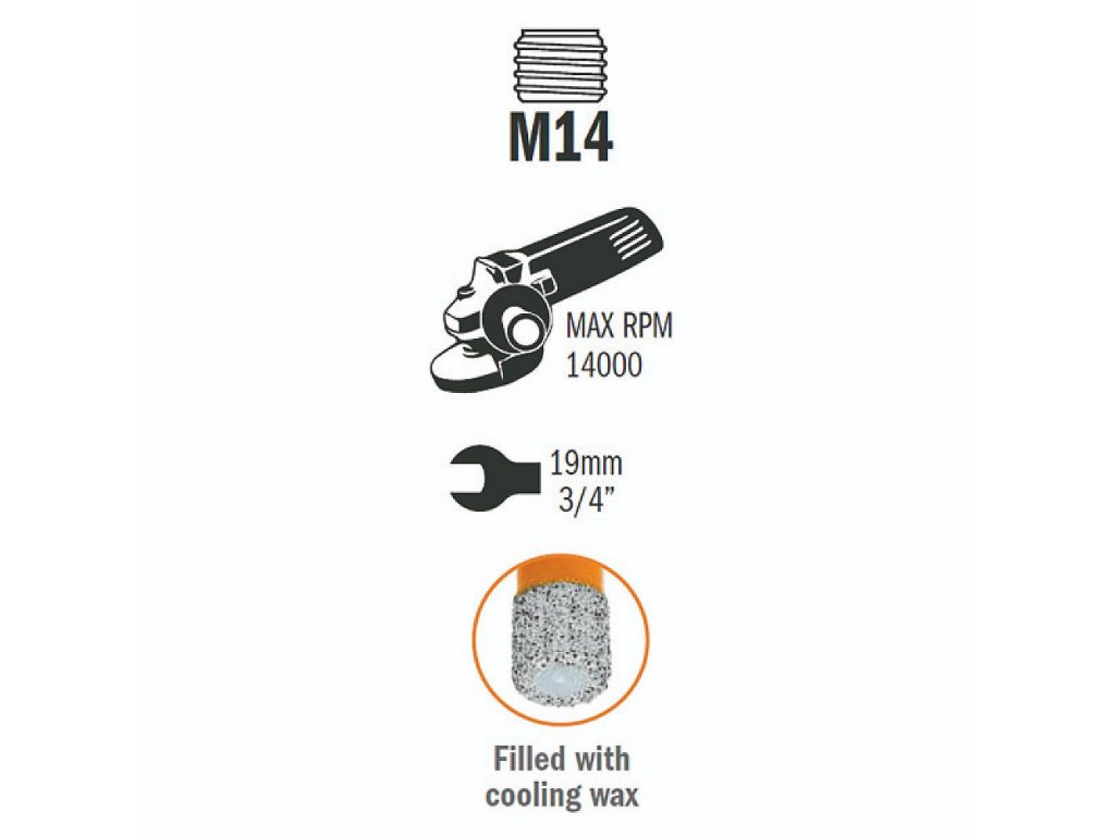 • Diamantový vrták.• Vyplněný chladícím voskem pro vrtání bez vody.• Upínací závit M14.DIAMANTOVÝ POVLAK (ZRNO) PRVOTŘÍDNÍ KVALITYSkvěle tvarované a extrémně silné teplovzdorné krystaly bez příměsí, které zajišťují rychlé čisté řezy a až 10x delší životnost.Vrtáky zaručují vynikající výkon a dlouhou životnost i při vrtání v těch nejtvrdších materiálech.Materiály:• dlaždice (keramické, gresové, apod.)• tvrdý kámen (žula, mramor, apod.)• umělý kámen (Okite®, Silestone®, apod.) Parametry:• Celková délka: 60 mm• Řezná hloubka: 35 mm• Maximální otáčky: 14000 ot./min.• Upínací závit: M14 pro použití do úhlových brusek• Příklep mějte při použití vrtáků vždy vypnutý.