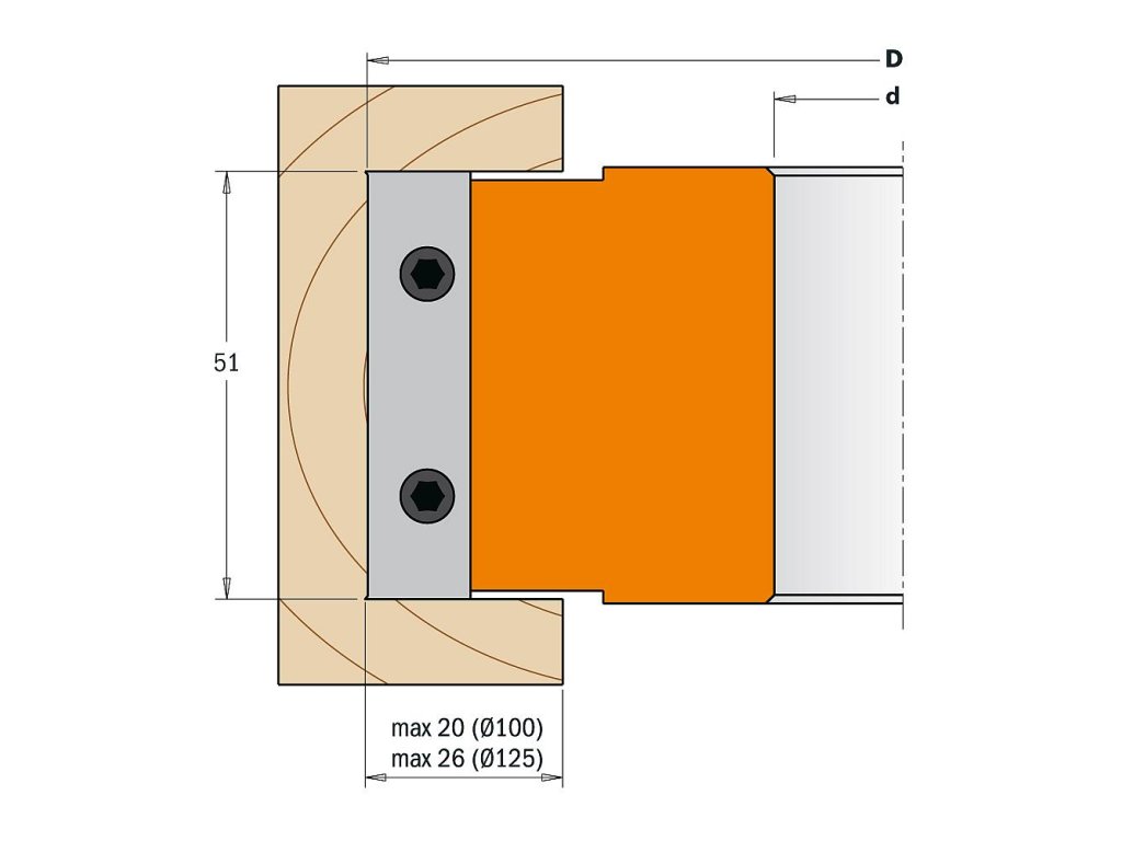 Frézovací hlava se střídavě šikmými zuby, které zaručí mnohem čistší řez i při použití rychlejšího posuvu než u fréz se zuby rovnými. Fréza je osazena 4 předřezovými žiletkami pro precizně odfrézované rohy bez otřepů v polodrážkách či drážkách a 2 uběrací šikmé zuby.