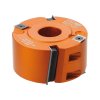 Frézovací hlava se střídavě šikmými zuby, které zaručí mnohem čistší řez i při použití rychlejšího posuvu než u fréz se zuby rovnými. Fréza je osazena 4 předřezovými žiletkami pro precizně odfrézované rohy bez otřepů v polodrážkách či drážkách a 2 uběrací šikmé zuby.