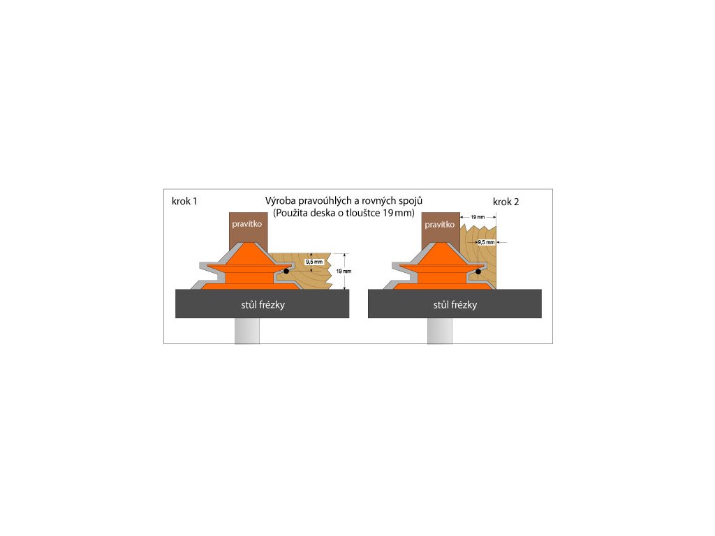 TIP: Pro dosažení dokonalého pravoúhlého spoje položte jeden dílec vnitřní plochou dolů na pracovní stůl a vycentrujte jej vůči fréze. Frézujte podle níže uvedeného vyobrazení kroku 1. Frézujte druhý dílec umístěný vnitřní plochou vertikálně vůči fréze a pravítku, jak ukazuje krok 2.