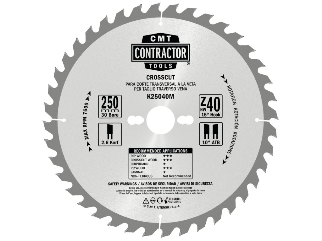 Kotouče Contractor s tvrdokovovými zuby jsou určeny pro řezání stavebního materiálu, jako je měkké dřevo, OSB a překližka, bez větších nároků na kvalitu řezu. Jedná se o cenově dostupný kotouč s vynikajícím poměrem výkonu a ceny. Dodáváno ve výhodném balení Masterpack po 10 ks (D250 po 5ks). Vhodné na stavby, hobby použití nebo pro větší výrobny. Ideální nejen pro okružní pily a pokosové pily.