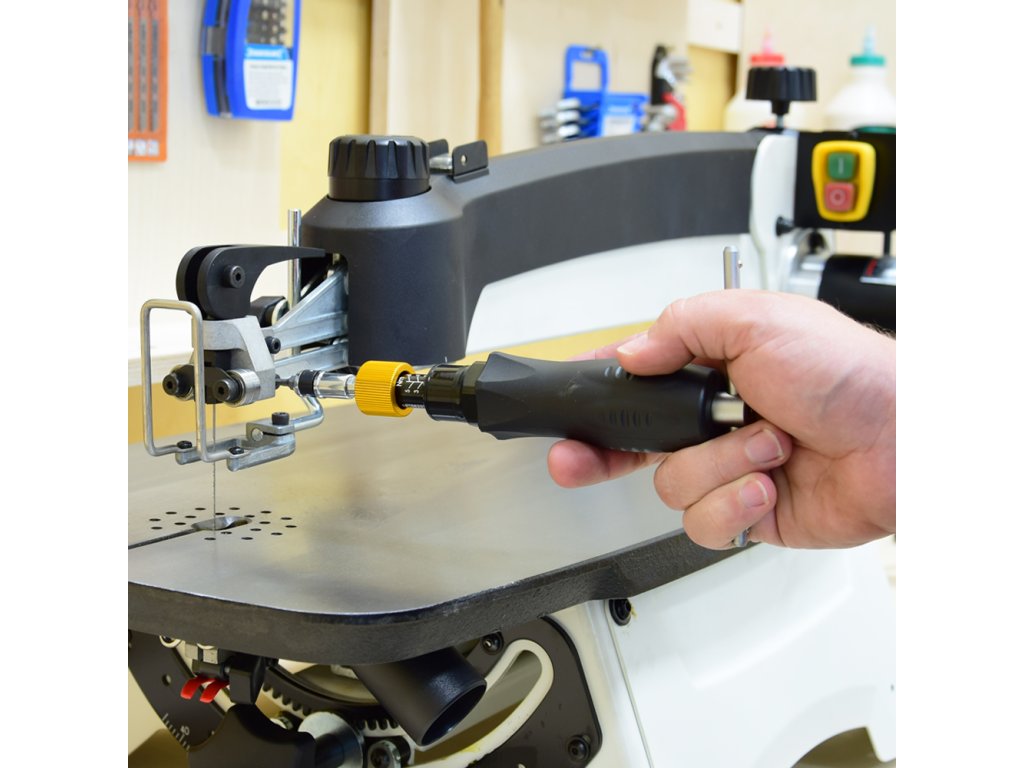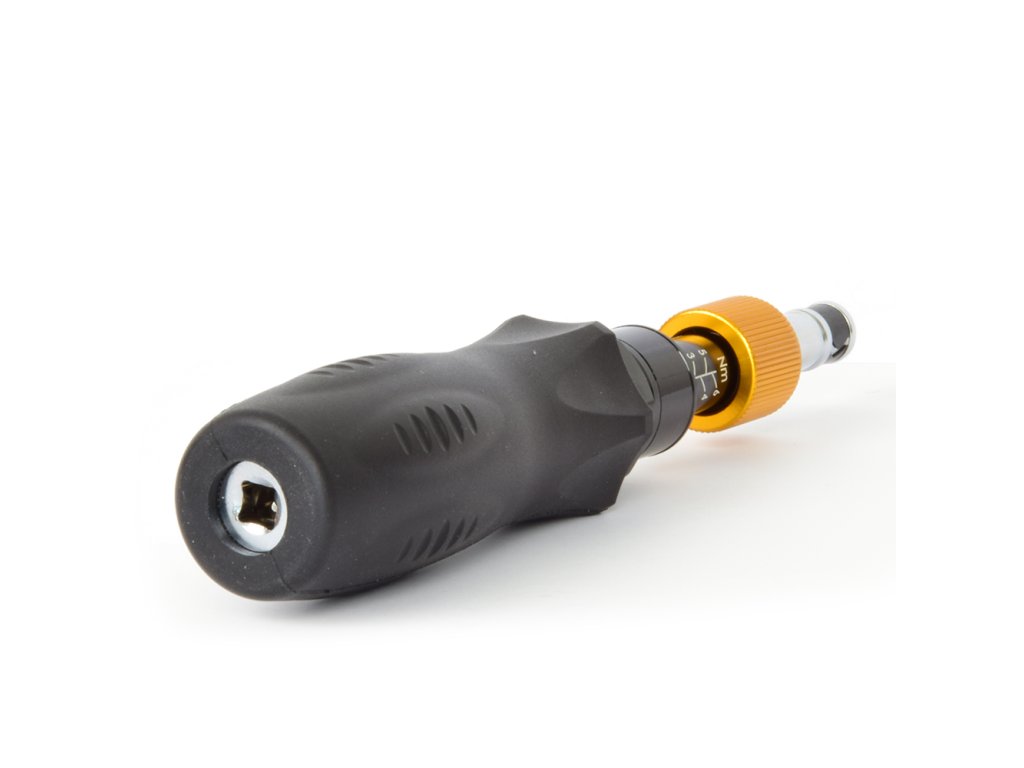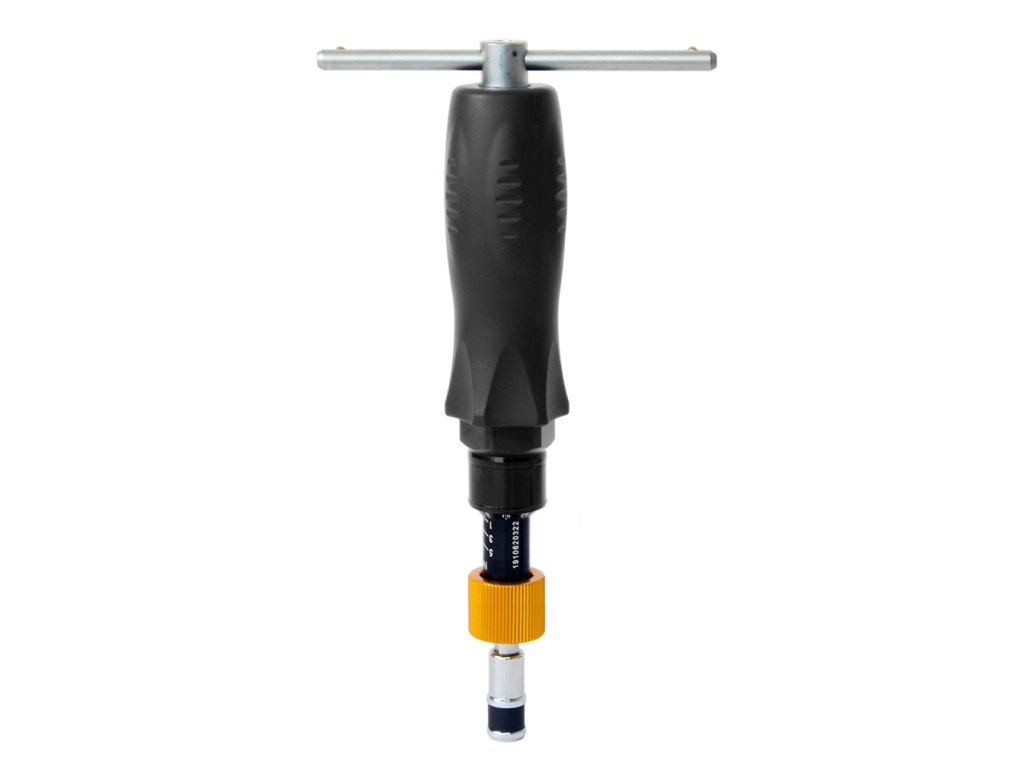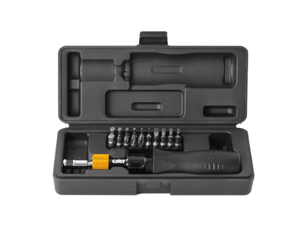 Šroubovák pro snadné upínání a povolování HW nožů a žiletek do stopkových fréz a frézovacích nebo hoblovacích hlav přesně podle požadovaného upínacího momentu. Upínáním žiletek pomocí momentového šroubováku se vyvarujete prasknutí žiletky při přetažení nebo naopak jejímu povolení, pokud byla utažena nedostatečně. Šroubovák lze díky přiložené redukci využít i pro upínání nástrčných šestihranných klíčů s upínáním 1/4“. Pomocí numerického ukazatele na šroubováku přesně nastavíte utahovací moment v krocích po 0,1 Nm v rozsahu 1-6 Nm. Dosažení požadovaného momentu upínání je zvukově indikováno cvaknutím mechanismu, který je zároveň rozpoznatelný mírným zavibrováním rukojeti. Momentový šroubovák je vybaven upínáním 1/4“ v rukojeti, kde je možné upnout T-klíč (není součástí balení) pro snažší dosažení vyššího točivého momentu.