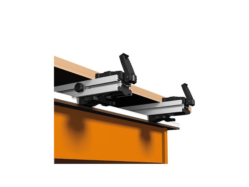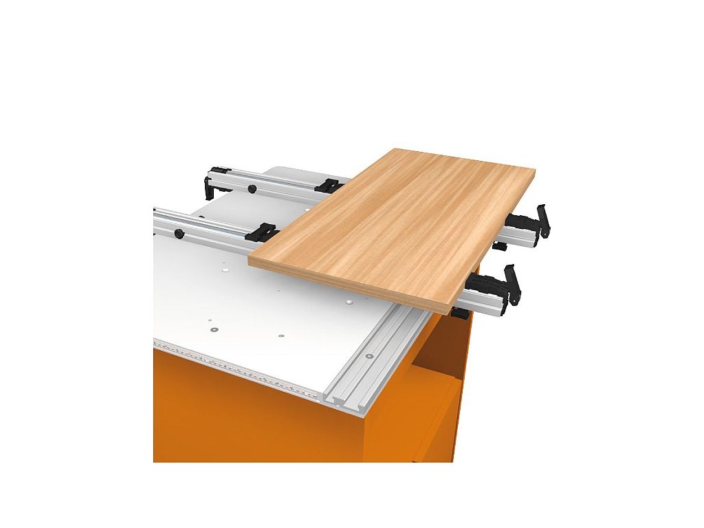 Pro změnu a rozšíření využití pravítek s rychloupínacím systémem Vám stačí dvě pravítka, která položíte na sebe horní plochou a zajistíte je pomocí čtyř spojovacích T-konektorů. Připevněte spojená pravítka spodními čelistmi k desce stolu a k horním pravítko můžete upnout dřevo pomocí upínacího systému druhého pravítka. Díky nízkému profilu čelistí je pracovní povrch dobře dostupný pro opracování. Dvě spojená pravítka lze kdykoliv znovu rozebrat a používat je opět samostatně.