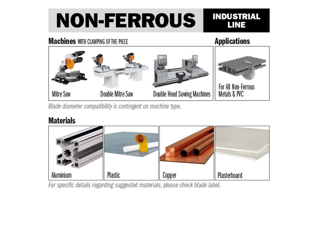 Pilový kotouč s pozitivním úhlem čela. Konstruován pro vysoký výkon, kvalitní řez a dlouhou životnost ostří. CMT kotouč pro neželezné kovy a plasty je ideální pro profesionální stroje s dobře upevněným řezaným materiálem. Použití pro řezání hliníkových výlisků a profilů a tabulí z plastů a pryskyřic (Pertinax). POZOR: Doporučujeme používat mazání emulzemi.