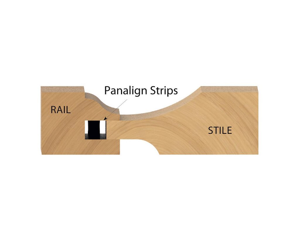Obrázek: STILE = svislý vlis, RAIL = vodorovný vlis, Panalign Strips = Vyrovnávací těsnění
