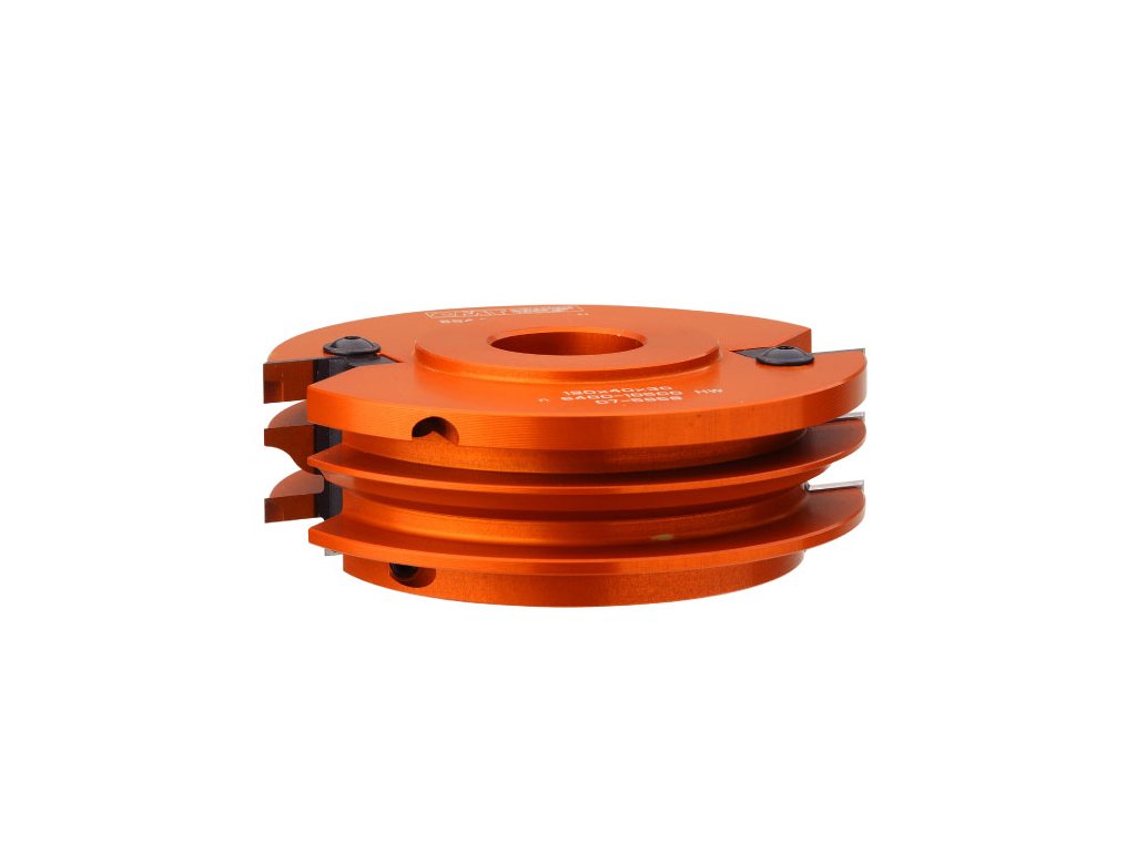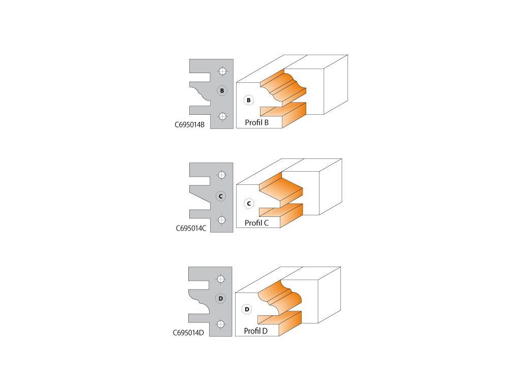 Fréza je vybavena 2 profilovými tvrdokovovými žiletkami. Pouhým vysunutím frézy nad stůl zvolíte, zda budete vyrábět profil, který je vybroušen v dolní části žiletky nebo dílec otočíte a posunete frézu pod stůl tak, aby zabírala horní část žiletky, na které je vybroušen kontra profil. Můžete vyrobit až 4 typy rámečkových profilů. Dodáváno s profilem A. Další profilové žiletky typu B, C a D jsou dodávány jako náhradní díly. Konstruováno pro šířku rámu od 22 do 26 mm. Upínací průměr d = 30, 40 nebo 50 mm.