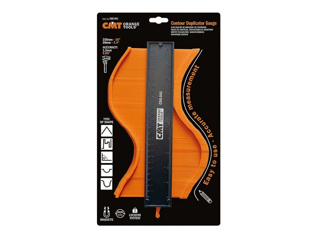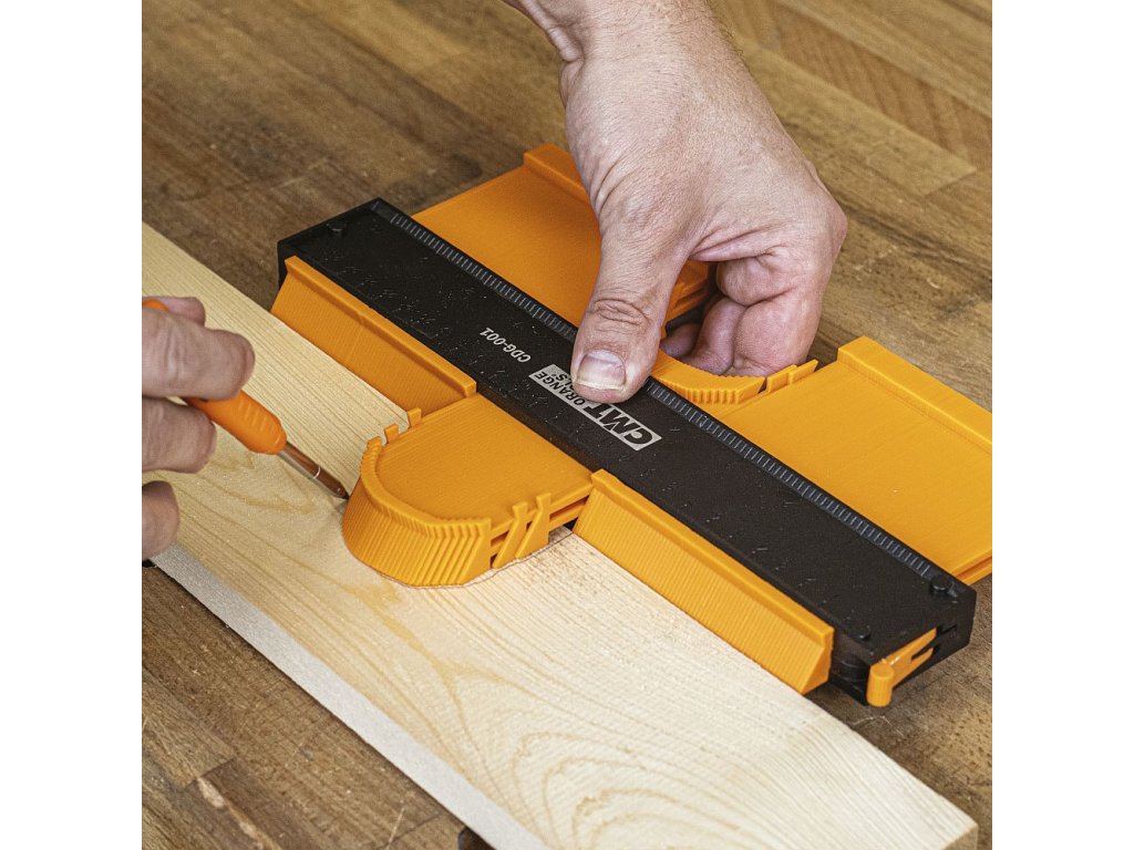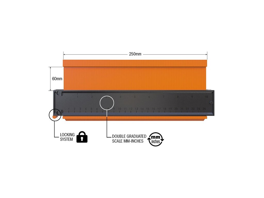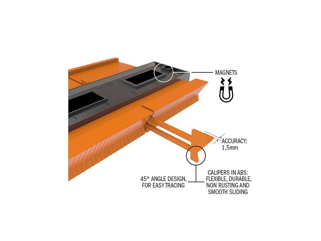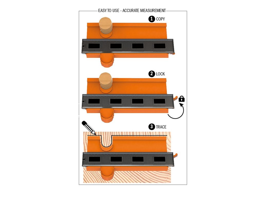 Pro přesné přenášení obrysů různých materiálů, i zakřivených.Snadno posuvná měřítka navržená pro kopírování jakéhokoli tvaru: roury, sloupu, trubky, pravidelného a nepravidelného tvaru stěn, soklové lišty, stropní lišty, rámu dveří a oken.Vhodné pro materiály jako jsou dlaždice, dřevo, kompozit, porcelán, keramika, vinyl a podlahové krytiny.Snadné a rychlé montáže bez odhadování, oprav a plýtvání materiálem.• Šířka šablony: 250 mm• Maximální hloubka obrysu: 60 mm• Šířka lamely: 1,5 mm