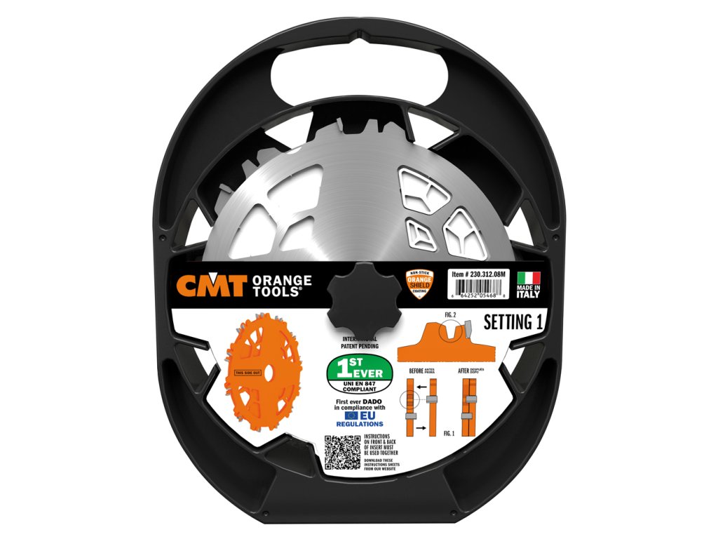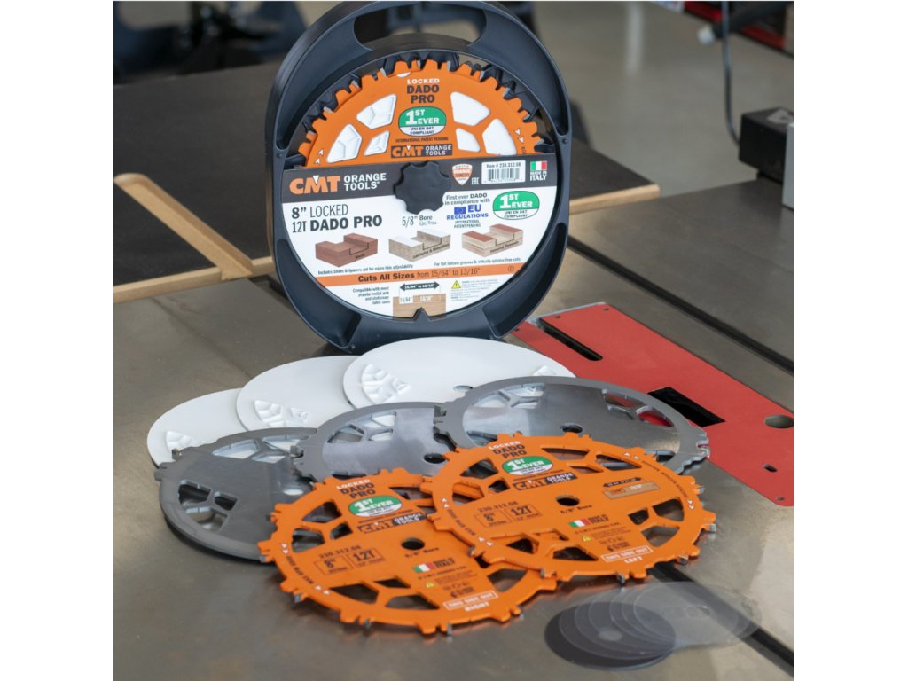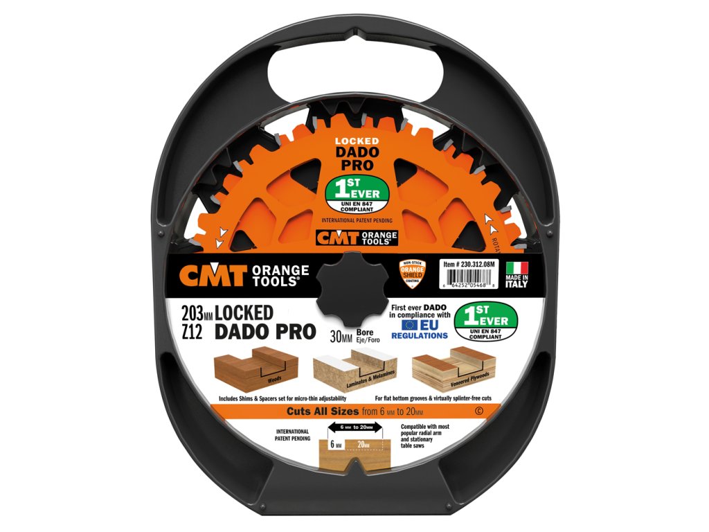 Unikátní sada CMT kotoučů Dado Pro je první Dado sada, která vyhovuje normě UNI EN847. Zatímco se Dado kotouče otáčí, jednotlivé prvky se nikdy nedostanou do vzájemného kontaktu, to je možné díky jedinečné konstrukci těl kotoučů a díky speciálním vymezovacím podložkám se zámky.