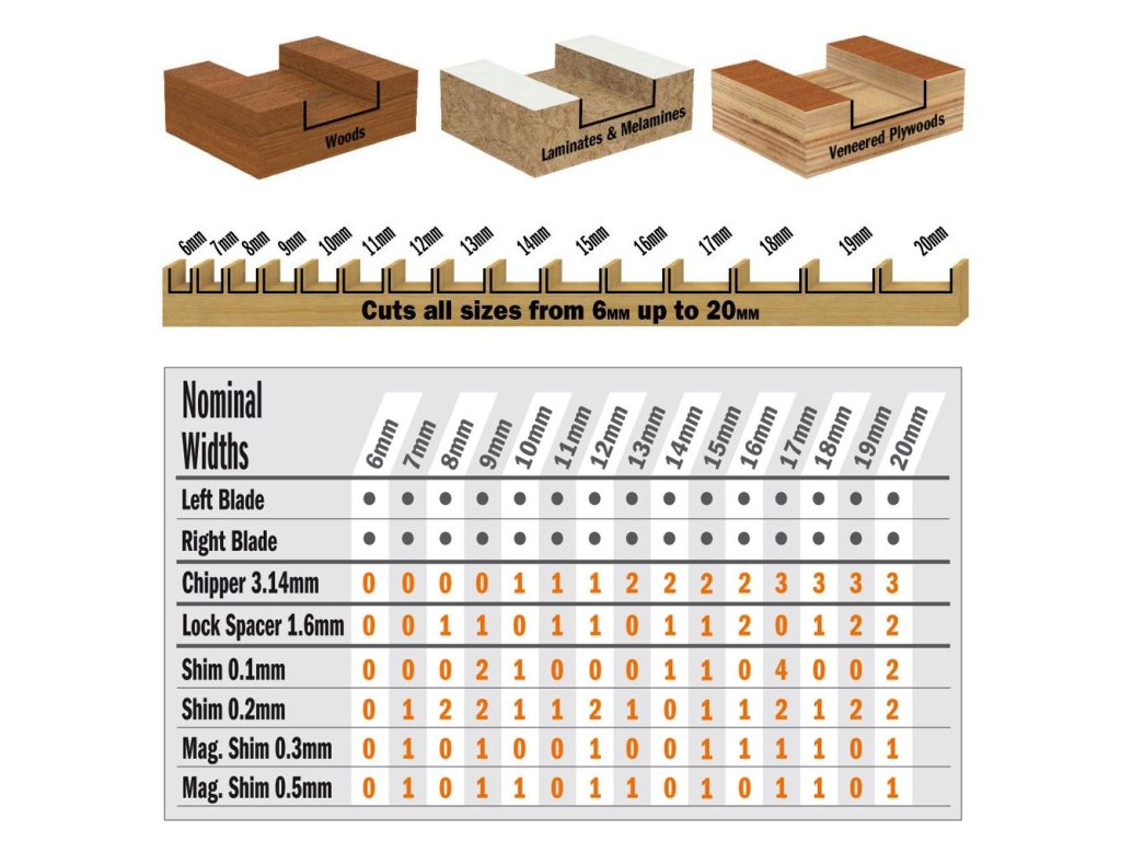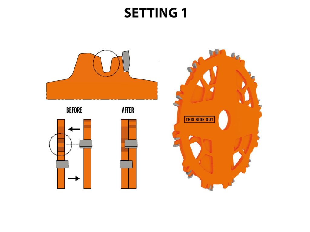 Přesnou šířku drážky můžete ve všech nastaveních upravit vložením distančních kroužků (0,1 – 0,5mm) mezi kotouče a vymezovací podložky se zámky.