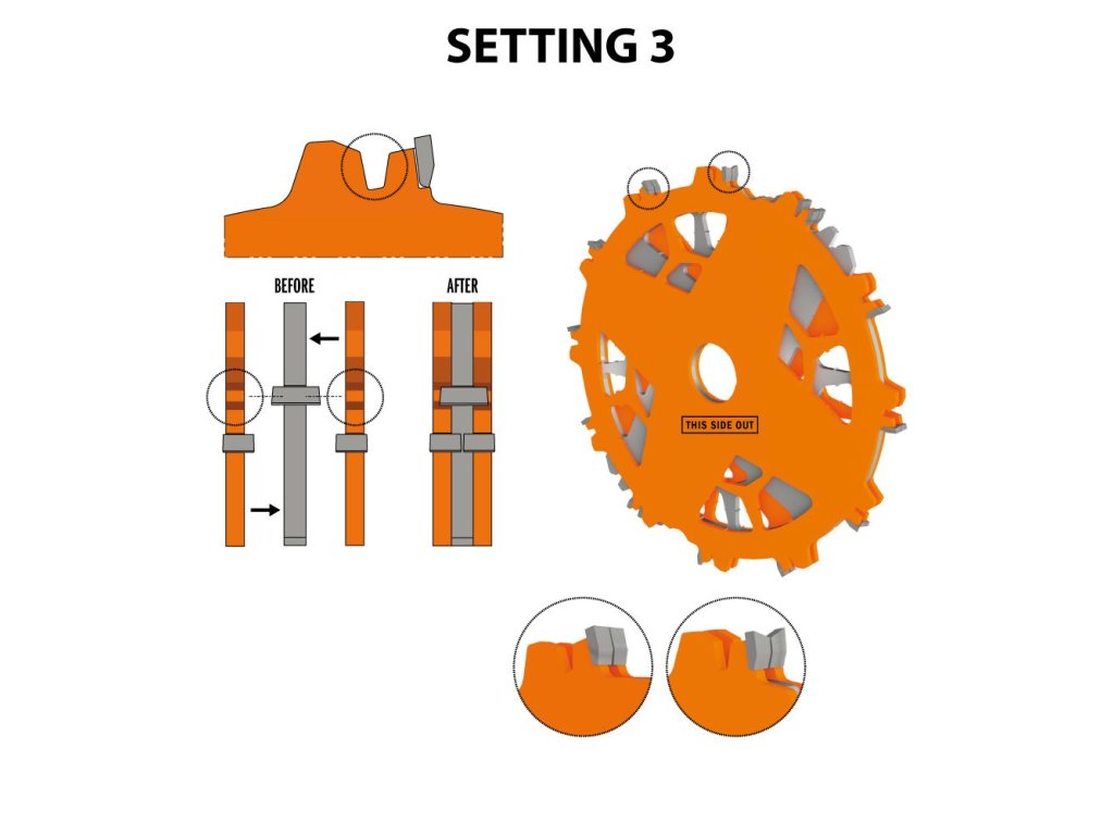 Nastavení 3: Pokud budete řezat širší drážky, které podle tabulky vyžadují použití středového kotouče, vložte středový kotouč mezi dva krajové kotouče tak, aby zuby středového kotouče přesně zapadali do výřezů v těle krajových kotoučů, které jsou ihned za jejich zuby (obdobně jako v Nastavení 1). Zuby krajových kotoučů by poté měli být z pohledu zboku v zákrytu.