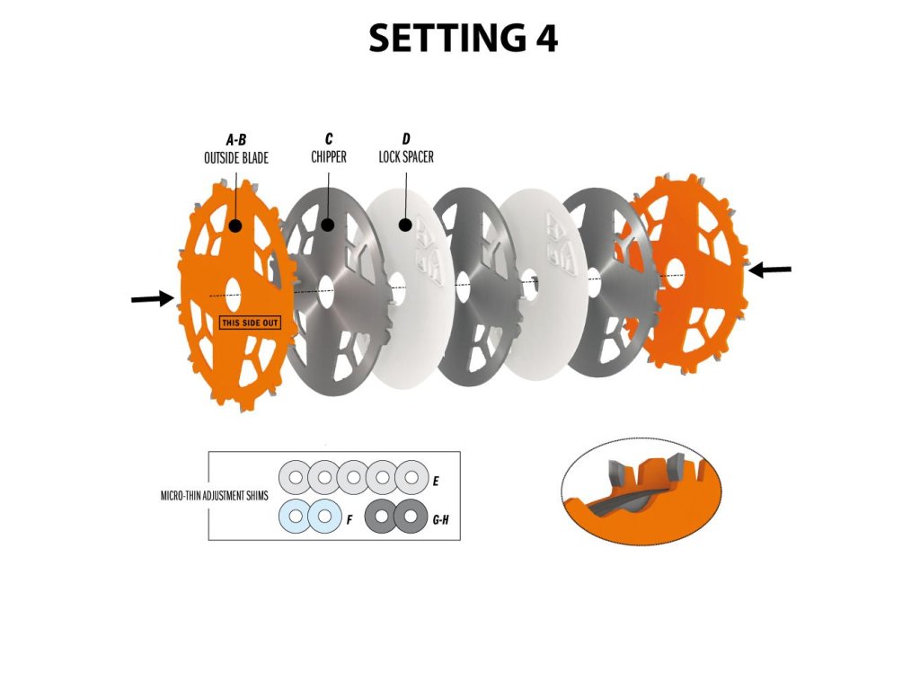 Nastavení 4: Pokud chcete řezat velmi široké drážky, které podle tabulky vyžadují použití vymezovacích podložek i středových kotoučů, skládejte sestavu vždy tak, aby mezi dvěma středovými kotouči byla vždy vymezovací podložka a zuby středových kotoučů zapadali do výřezů v krajových kotoučích, tak jako v předchozích nastaveních.