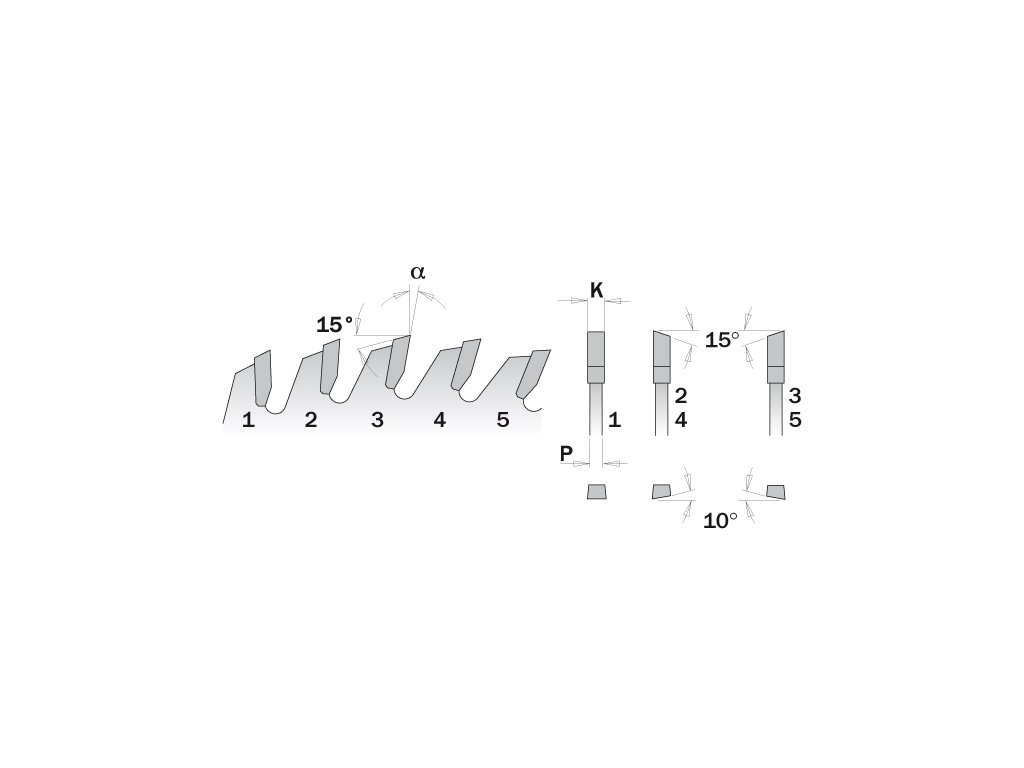 Pilový kotouč pro vysoce kvalitní dělení měkkého, tvrdého a exotického dřeva, laminátu, překližky, PVC a neželezných kovů. Speciální geometrie zubů s vybroušeným sklonem. Tvrdost plátků KCR06, pevnost 2300 N/mm2 a boční házivost do 0,05 mm.