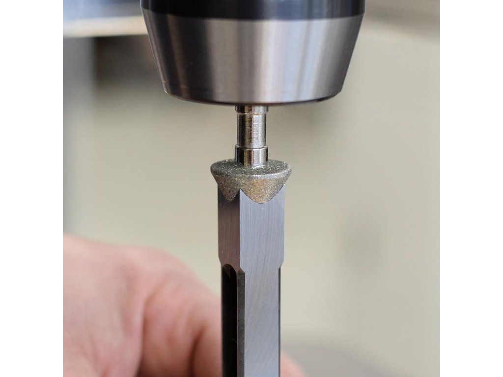 Tento speciálně vyrobený diamantový kuželový brousek doporučujeme pro většinu CMT a IGM japonských ostrohranných dlabacích vrtáků a pro čtvercová dláta Veritas.