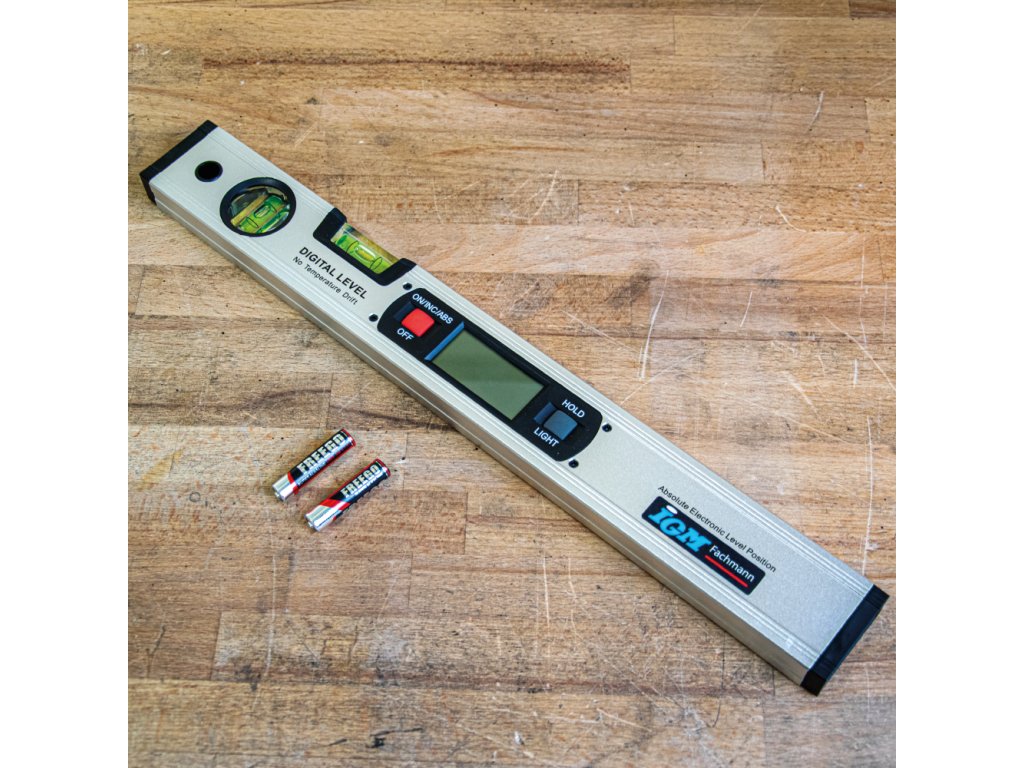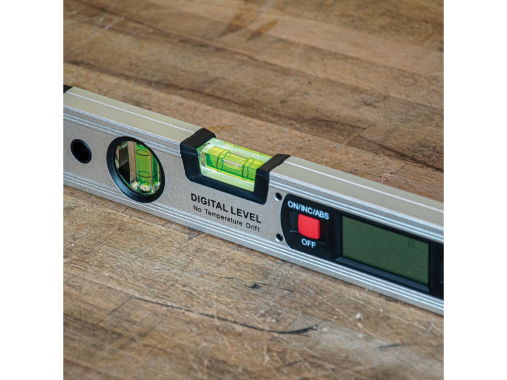 Digitální vodováha je dlouhá 40 cm, má 2 libely a digitální zobrazení úhlu. Elektronika vodováhy má řadu pokročilých funkcí. Měří úhel ve stupních k absolutní rovině nebo k relativnímu (zvolenému) úhlu. Užitečné směrové šipky označují odklon od roviny nebo vertikály. Kromě sklonu ve stupních zobrazuje také sklon v mm na 1 m délky. K dispozici je funkce HOLD pro přidržení naměřené hodnoty. Snadno čitelný Flip - displej s modrým podsvícením se automaticky převrací při práci nad hlavou.• Délka: 40 cm• Rozsah měření: 0-360°• Rozlišení: 0,1°• Baterie: 2 x AAA (LR03)• Rozměry: 416 x 50 x 21 mm• Hmotnost: cca 330 g