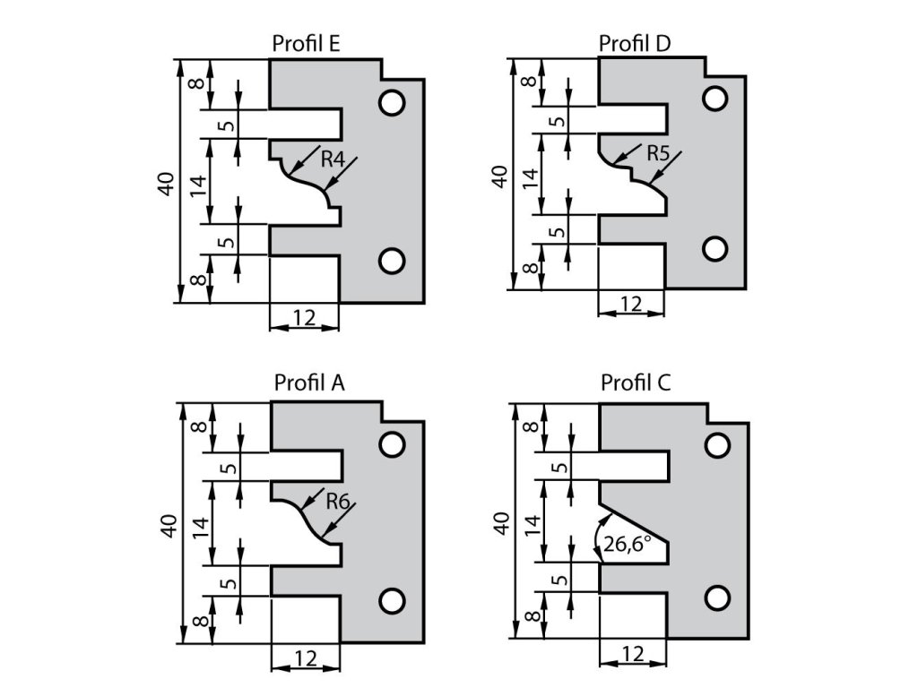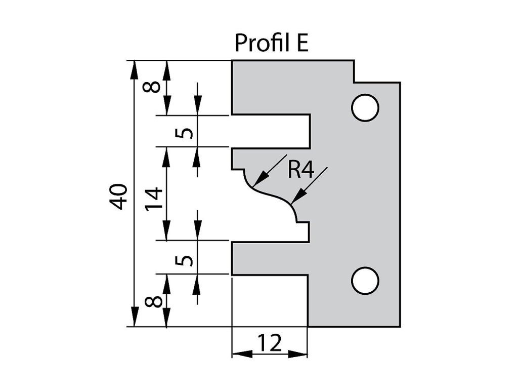 Fréza je vybavena 2 profilovými tvrdokovovými žiletkami. Dorazový šroub žiletek je zapuštěn pod úroveň žiletek, což vylepšuje možnosti použití a řezné vlastnosti frézy. Pouhým vysunutím frézy nad stůl zvolíte, zda budete vyrábět profil, který je vybroušen v dolní části žiletky nebo dílec otočíte a posunete frézu pod stůl tak, aby zabírala horní část žiletky, na které je vybroušen kontra profil. Můžete vyrobit až 4 typy rámečkových profilů. Dodáváno s profilem E. Další profilové žiletky typu A, C a D jsou dodávány jako náhradní díly. Konstruováno pro šířku rámu od 22 do 26 mm. Upínací průměr d=30 mm.