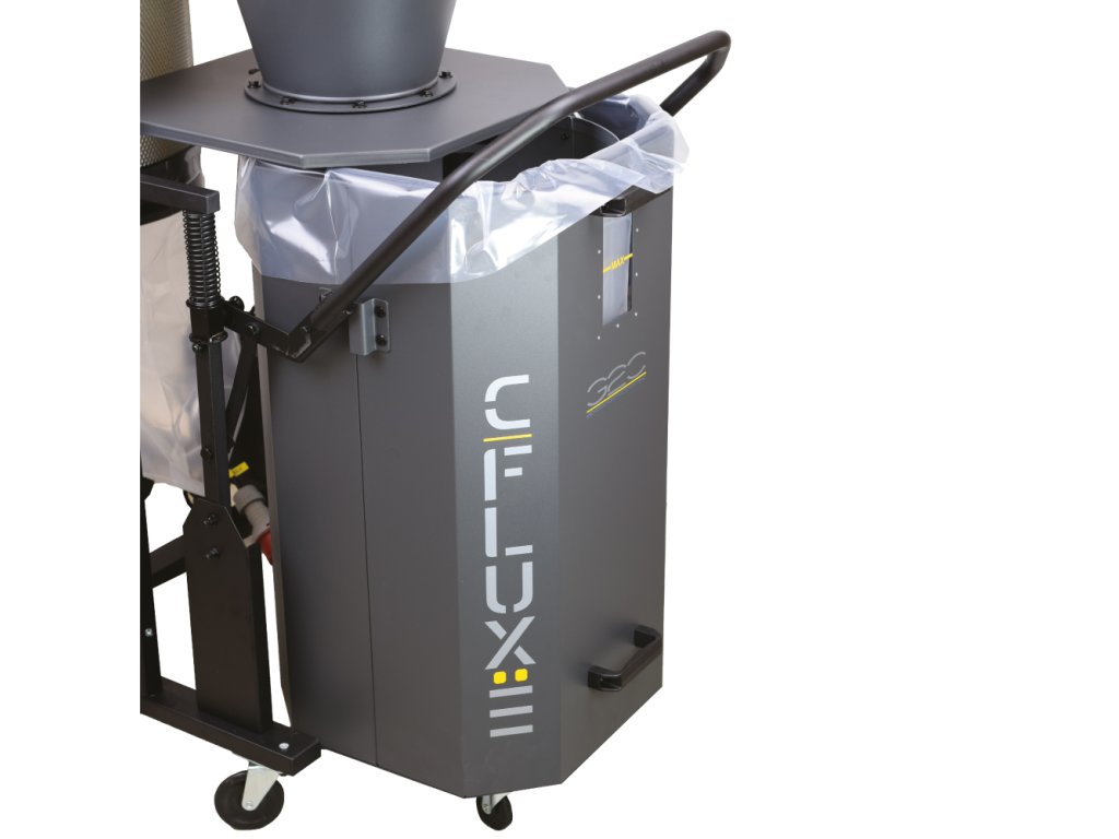 Vyprázdnění nádoby na odpad je velmi snadné. Důmyslný rychloupínací systém zajišťuje odejmutí kontejneru jedním pohybem. Zvednutím madla odejmete odpadní kontejner od odsavače. Naopak stlačením madla směrem dolů systém zvedne kontejner z podlahy a přitlačí k odsavači. Tím se zdvihnou kolečka nádoby do vzduchu a cyklon se lehce přesouvá pod dílně bez tahání kontejneru na hadici a usnadní např. vysávání pilin při použití podlahové hubice. Kontejner s odpadní plechovou nádobou je opatřen otočnými kolečky pro snadnou manipulaci. Mobilní kola odsavače jsou nově i brzditelná, pro pevné ustavení odsavače na svém místě. V odpadním kontejneru nově najdete i led světlo a průhled, abyste snadno zjistili stav zaplnění nádoby pilinami.