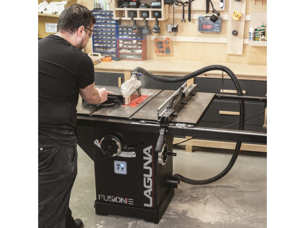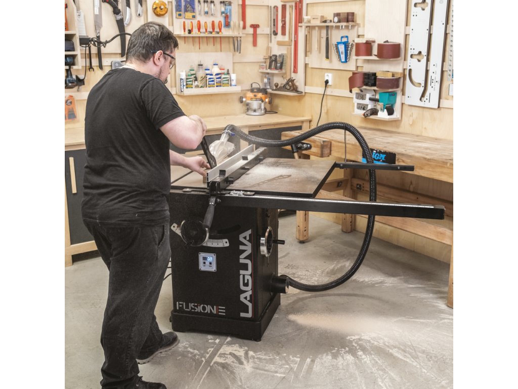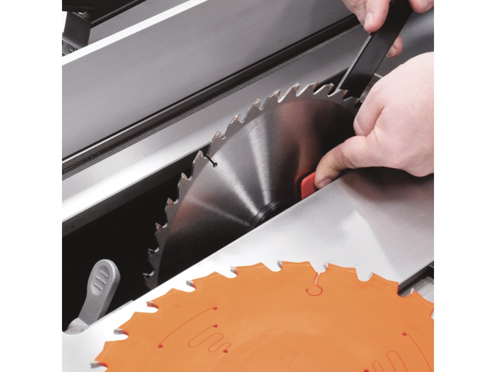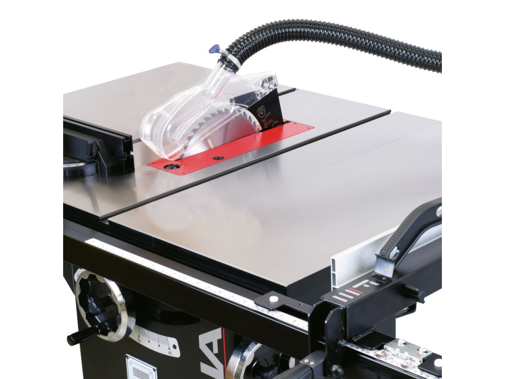 Velký litinový pracovní stůl je první, co vás na pile zaujme. Stůl poskytuje dostatečně velkou plochu při řezání velkých formátů. Pila Fusion 3Dro je dodávána se zadním prodloužením stolu o dalších 500 mm, které oceníte při řezání delších dílců. Součástí pily je masivní podélné pravítko s rukojetí z měkčeného plastu, které lze velmi lehce posouvat a zamknout ve zvolené pozici. Rozměr se odečítá na měřítku s odečítací lupou s možností kalibrace. Hliníkový profil pravítka lze posouvat v podélném směru a překlopit o 90 stupňů pro snazší řezání tenkých dílů. Lupa má dvě rysky, kdy jedna zobrazuje vzdálenost kotouče od profilu pravítka, který je ve standardní vertikální poloze a druhá zobrazuje vzdálenost kotouče, pokud profil pravítka otočíte o 90° do horizontální polohy. V litinovém stole jsou dvě praktické T-drážky pro použití úhlového pravítka z obou stran pilového kotouče.