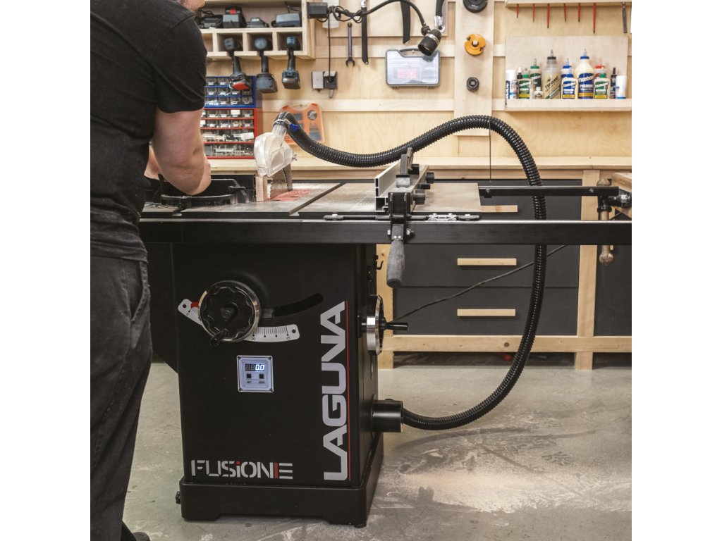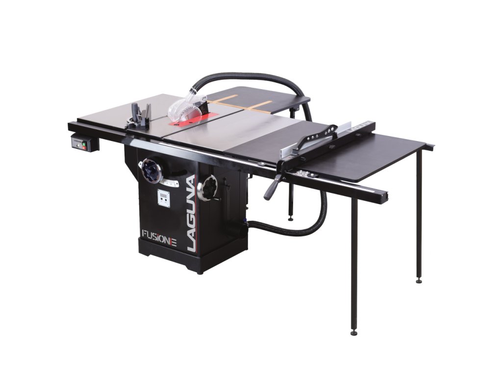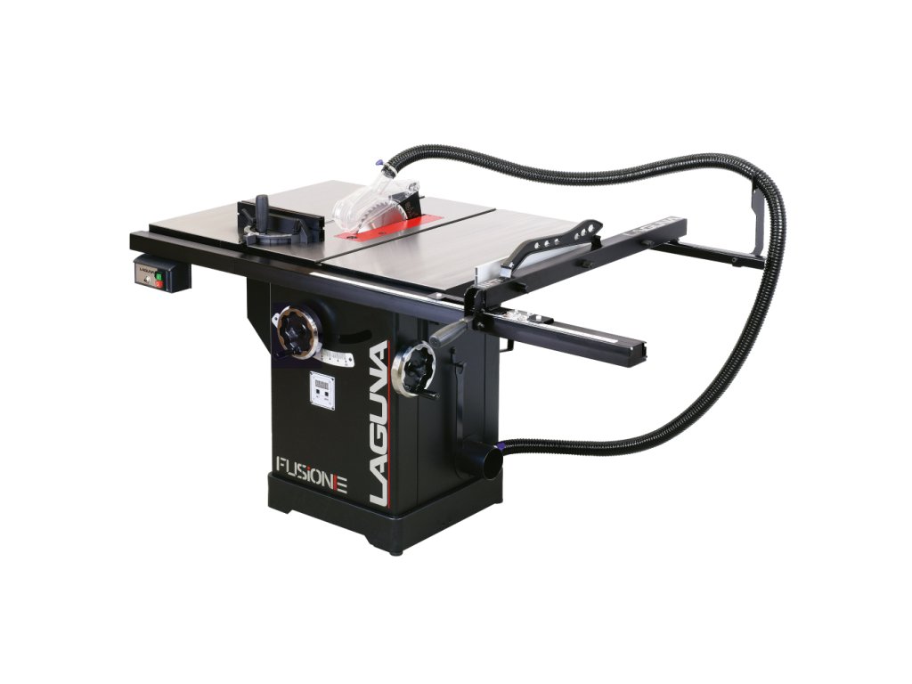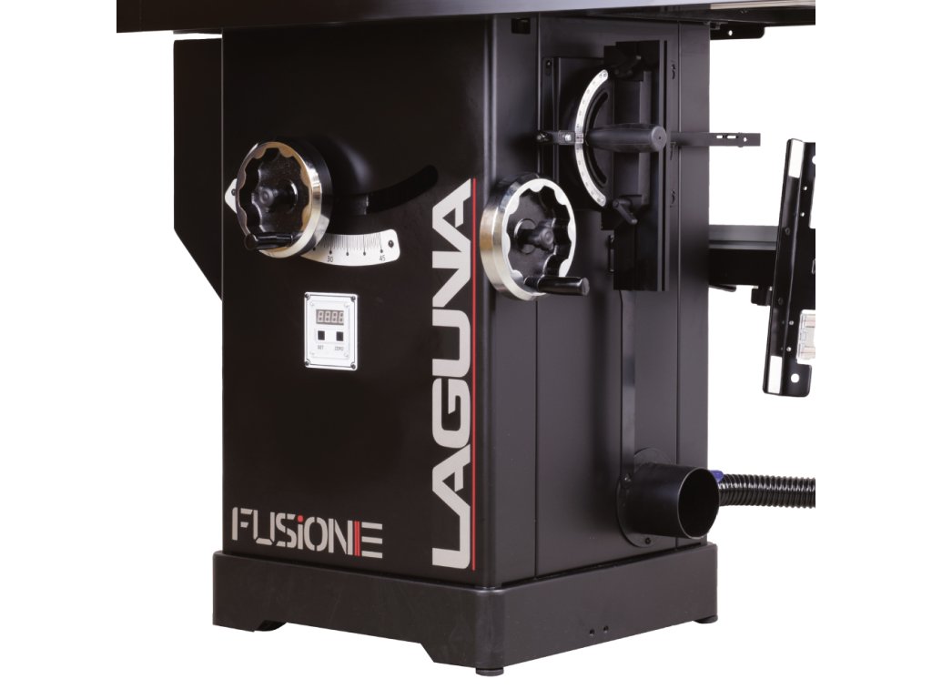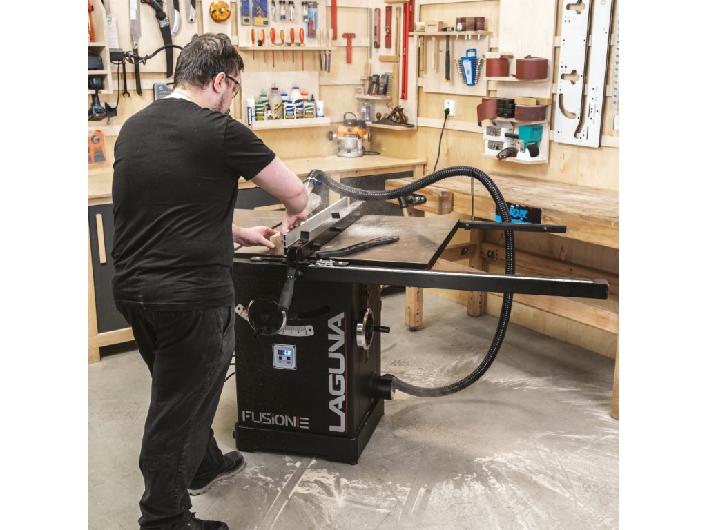 Velký litinový pracovní stůl je první, co vás na pile zaujme. Stůl poskytuje dostatečně velkou plochu při řezání velkých formátů. Pila Fusion 3Dro je dodávána se zadním prodloužením stolu o dalších 500 mm, které oceníte při řezání delších dílců. Součástí pily je masivní podélné pravítko s rukojetí z měkčeného plastu, které lze velmi lehce posouvat a zamknout ve zvolené pozici. Rozměr se odečítá na měřítku s odečítací lupou s možností kalibrace. Hliníkový profil pravítka lze posouvat v podélném směru a překlopit o 90 stupňů pro snazší řezání tenkých dílů. Lupa má dvě rysky, kdy jedna zobrazuje vzdálenost kotouče od profilu pravítka, který je ve standardní vertikální poloze a druhá zobrazuje vzdálenost kotouče, pokud profil pravítka otočíte o 90° do horizontální polohy. V litinovém stole jsou dvě praktické T-drážky pro použití úhlového pravítka z obou stran pilového kotouče.