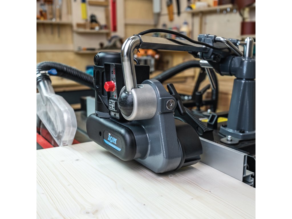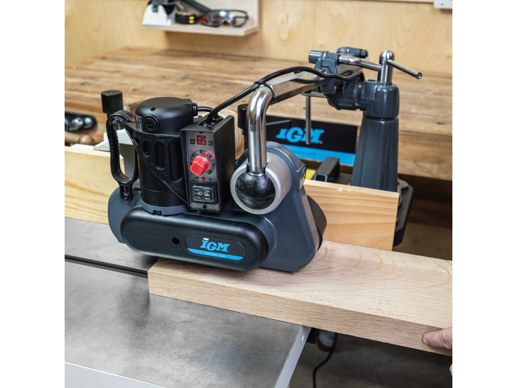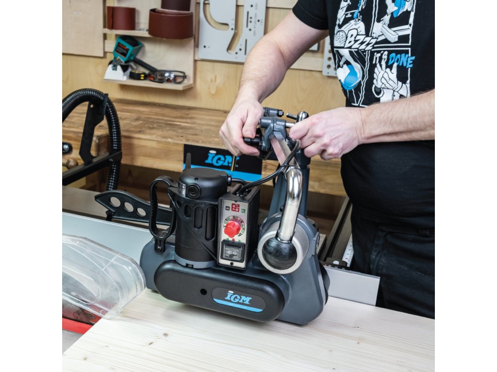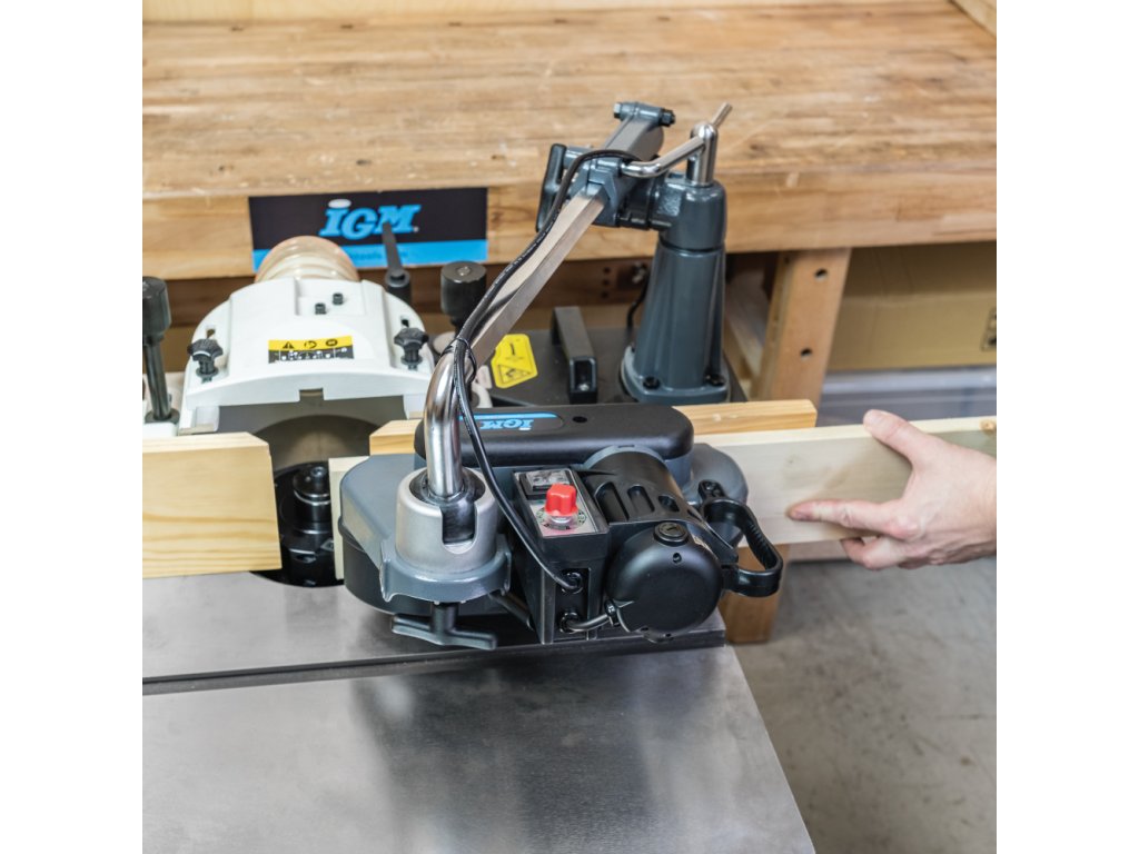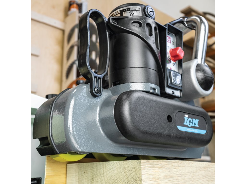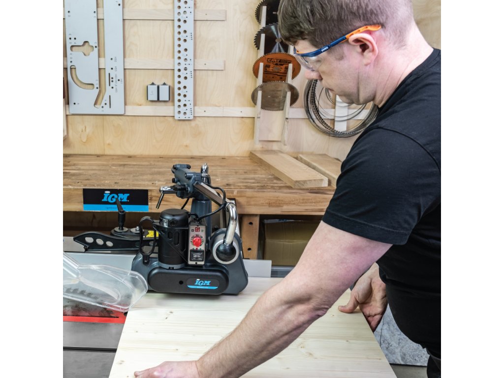 Malý a praktický podavač materiálu ideální pro použití na malé frézce, frézovacím stolku nebo srovnávačce či kotoučové pile, ale i manuální olepovačce. Tři odpružené podávací rolny s plynule měnitelnou podávací rychlostí v rozsahu 2-12m/min a s přepínáním zpětného chodu zajišťují precizní přilnavost a skvěle se vyrovnávají s nerovnostmi. Výsuvný stojan s ramenem má patentovaný 3D nastavitelný kloub pro optimální polohu podavače. Může být namontován přímo ke stolu stroje šrouby (nutno vrtat díry) nebo snadněji pomocí IGM Instalační desky pro podavače.