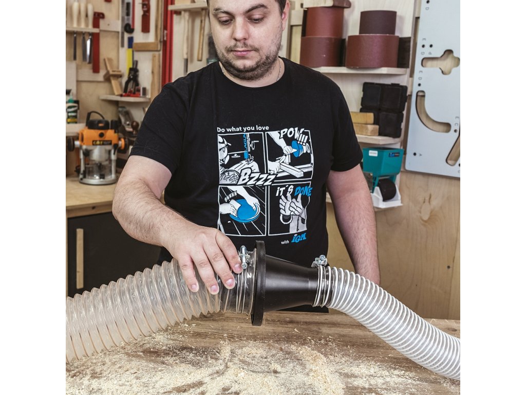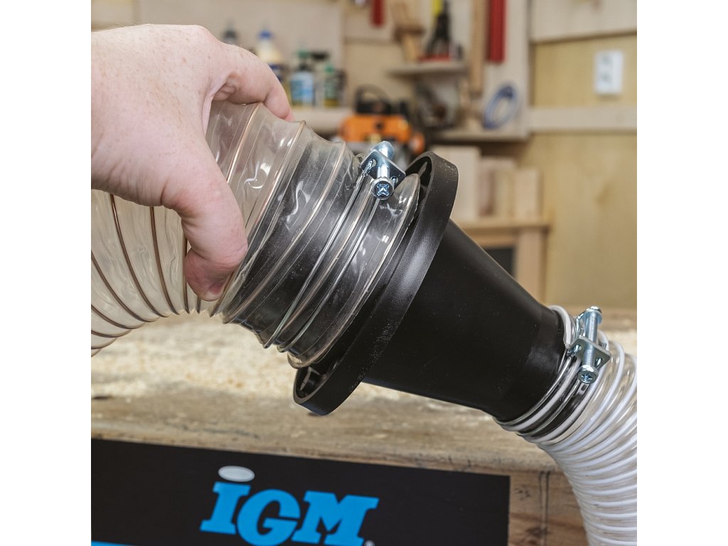 IGM Magnetický konektor odsávání jako redukce pro hadice o průměru 63 mm a 100 mm slouží pro rychlé spojení a odpojení hadice mezi strojem a odsavačem. Konektor se skládá ze dvou částí. Redukční část 100 mm je osazena 8 magnety, které ji pevně spojí s redukční částí 63 mm osazenou zmagnetizovaným kroužkem. Součástí jsou dvě drátové spony (63 mm a 100 mm) pro trvalé upnutí k hadici.