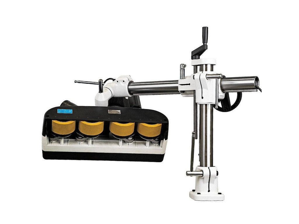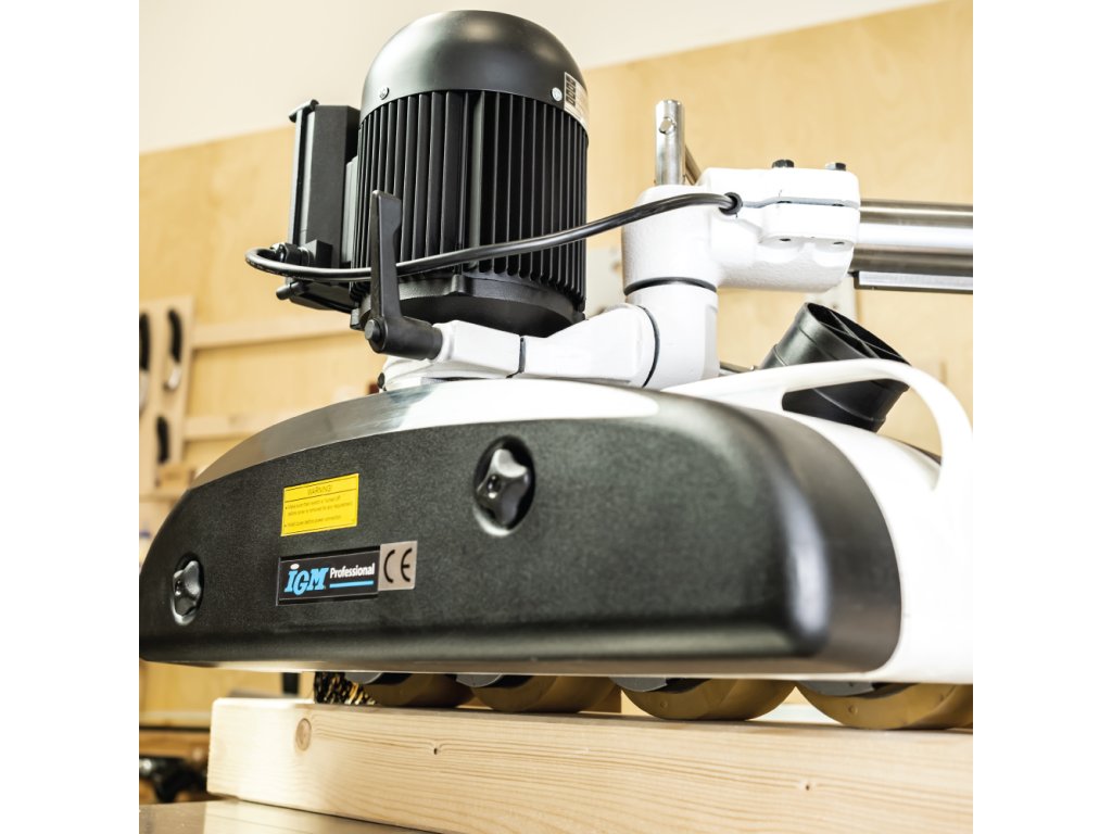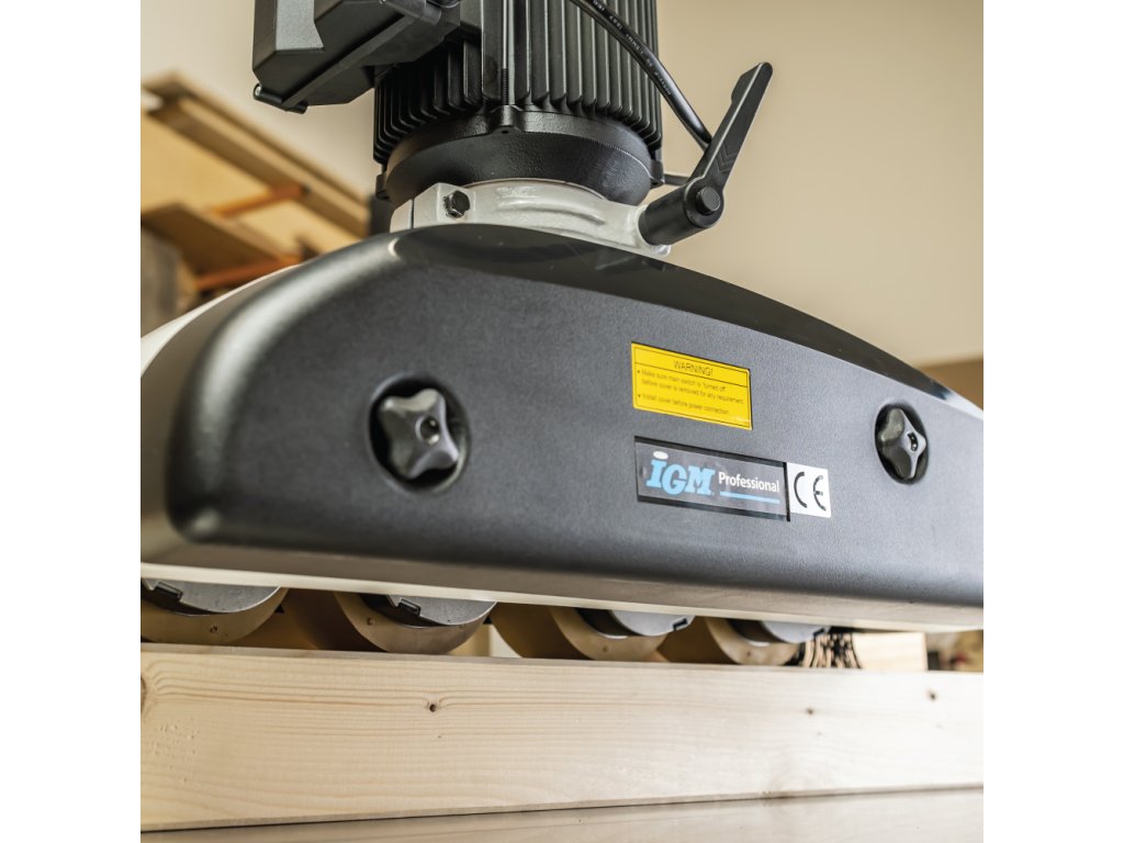 Profesionální kategorie podavače materiálu se čtyřmi odpruženými rolnami, které mají výbornou přilnavost a skvěle se vyrovnávají s nerovnostmi. Je ideální pro konstantní posuv při frézování nebo řezání dřeva i jiných materiálů. Volit můžete z osmi rychlostí podávání, které se mění pozicí ozubených kol po sejmutí krytu. Zpětný chod se ovládá ručním ovladačem. Vodorovná i svislá poloha podavače se nastavuje na universálním stojanu pomocí dvou ovládacích šroubů a poté se bezpečně zajistí. Hlavu podavače lze otáčet všemi směry (360°), takže jej lze použít k vodorovnému nebo svislému tlaku na materiál. Může být namontován přímo ke stroji šrouby (nutno vrtat díry do stolu) nebo pomocí IGM Instalační desky pro podavače. Pro použití na profesionální frézce nebo srovnávačce či kotoučové pile při dlouhodobém provozu. Je možno vybavit IGM Odklápěcím zařízením (kód: 141-FP) pro snadné a rychlé odklopení bez nutnosti odmontování.