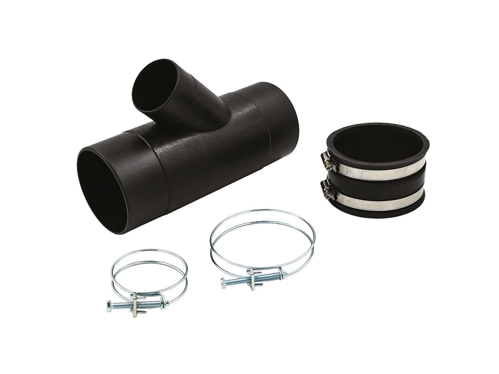 Odbočka 45° pro odsávací hadici s redukcí ze 100 mm na 63 mm pro napojení shora k frézovacímu stolku nebo krytu kotouče. Včetně spon k uchycení hadic a gumové spojky pro připojení přímo ke stroji.