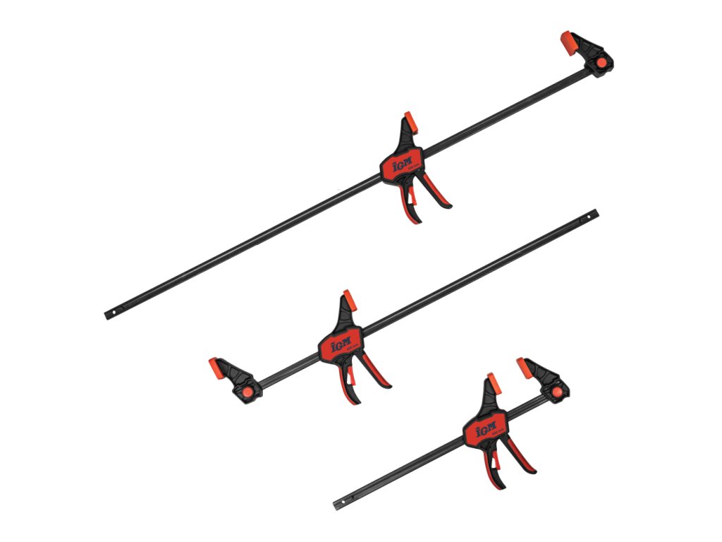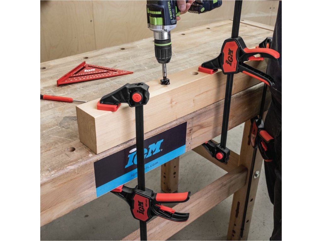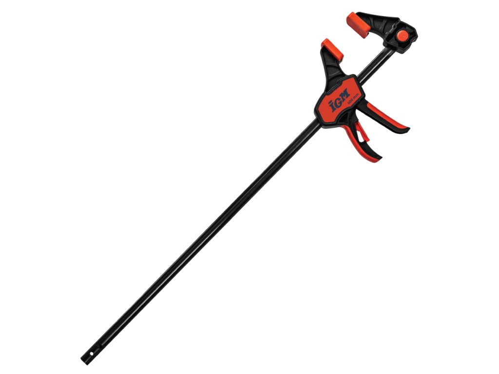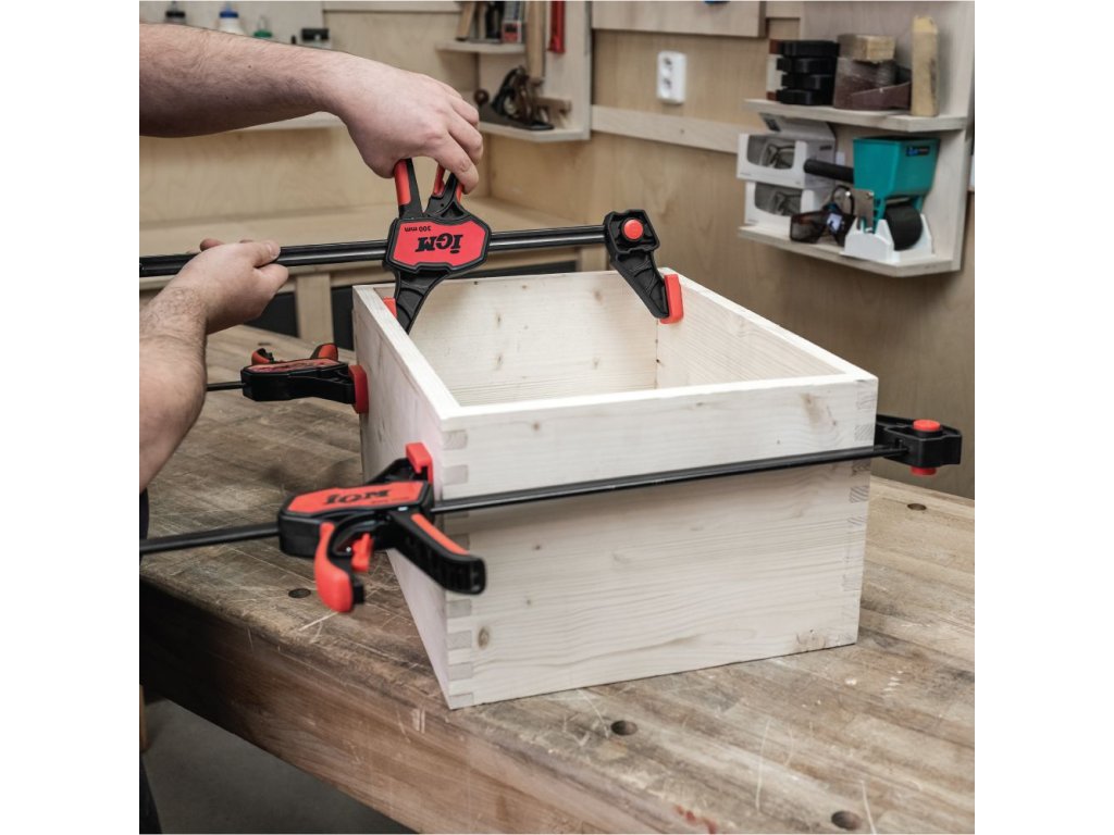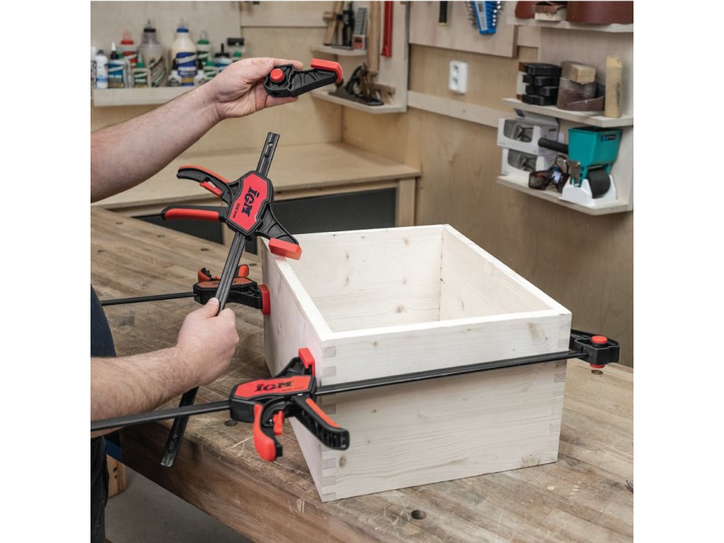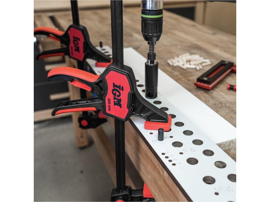 IGM Quick Rychloupínací svěrka je určená pro rychlé stahování nebo rozpínání jakéhokoli materiálu. Svěrku lze ovládat pouze jednou rukou pomocí rychloupínací pogumované rukojeti. Čelisti svěrky s hloubkou 85 mm jsou vyrobené ze skelného vlákna a nylonu, což dělá svěrku pevnou a odolnou. Čelisti jsou osazeny měkkými plastovými podložkami o rozměru 40x47 mm. Podložky vyrobené z termoplastické gumy TPR nepoškodí ani nejjemnější dřevo. Vodicí tyč 5x19 mm je vyrobena z uhlíkové oceli. Svěrka je vybavena odnímatelnou čelistí se zamykacím tlačítkem pro přeměnu na rozpěrku. Maximální upínací síla až 150 kg.