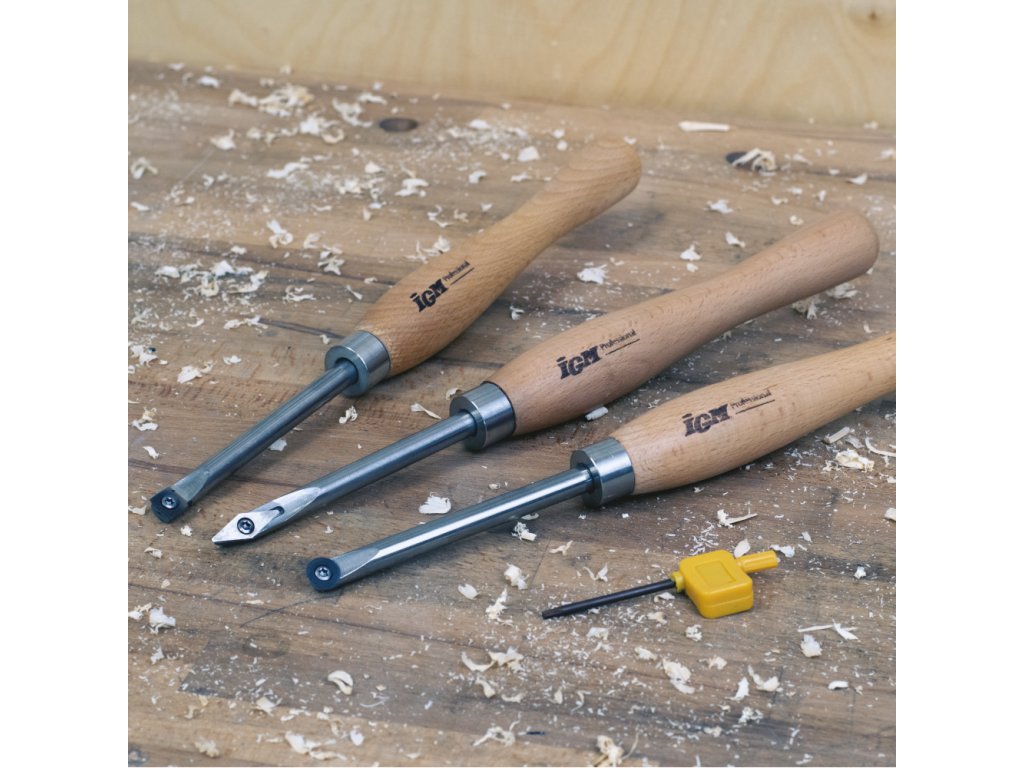 IGM Sada soustružnických dlát s výměnnými břity obsahuje 3 dláta se třemi typy břitů – čtvercový, kulatý a diamantový. Čtvercový se používá k hrubování materiálu a vytváření čepů, kulatý lze využít také k hrubování materiálu nebo soustružení křivek. Diamantovým břitem pak vysoustružíte drážky a jiné ozdobné detaily. Břity jsou vyrobeny z tvrdokovu s velmi vysokou životností a nemusí se ostřit. Pokud se hrana opotřebuje, stačí břitem pootočit. Jakmile je hrana po celém obvodu tupá, břit vyměňte.