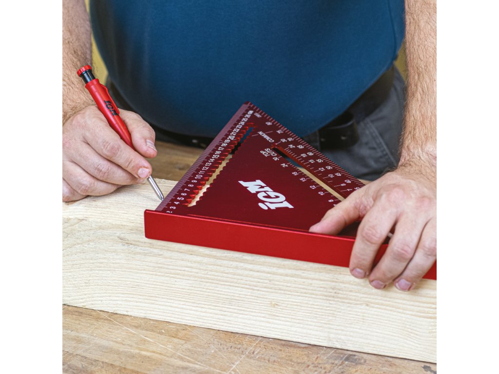 • Přesný robustní úhelník.• Nutnost pro každého tesaře.• Laserem značené stupnice na obou stranách.• Rychlé a přesné podélné rýsování rovnoběžných čar.• Slouží jako vodítko pily.Přesný duralový IGM Tesařský úhelník je nutností pro každého tesaře. Robustní úhelník má snadno čitelné, laserem značené stupnice po 1 mm na obou stranách. Kolmá strana má stupnici do 175 / 300 mm se zářezy po 5 mm, což umožňuje rychlé podélné rýsování rovnoběžných čar. Přepona má stupnici od 0° do 90° a stupnici pro tvorbu běžných krokví, nárožních a úžlabních trámů. Je ideální pro rychlé rýsování čar nebo jako vodítko pily. Výrazně zjednodušuje stavbu střešní konstrukce.• Materiál ze slitiny hliníku je odolný proti opotřebení a korozi.• Rozměr úhelníku: 175 x 175 x 248 mm / 300 x 300 x 430 mm.• Tloušťka profilu 5 mm.• Šířka dorazu 28 mm.
