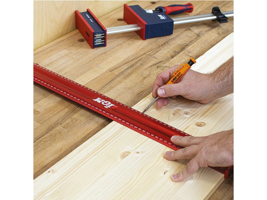 • Duralové eloxované pravítko, odolné proti opotřebení a korozi.• Dobře čitelné vylaserované stupnice po 1 mm.• Dvě stupnice, jedna klasická a druhá s nulou uprostřed.• Masivní, tuhá konstrukce pravítka.• Doraz je možné namontovat na oba konce pravítka.Přesné duralové pravítko nejen pro truhláře. Vylaserovaná stupnice zaručuje přesnost a její zkosení usnadňuje rýsování tužkou. Na jedné straně je klasická stupnice 0 – 600 mm, na druhé straně začíná 0 ve středu pravítka a stupnice je vpravo i vlevo do 300 mm. Otvory na konci pravítka slouží k upevnění dorazu, abyste dosáhli vysoké přesnosti při rýsování kolmo k hraně dílce. Prolisy v těle pravítka usnadňují manipulaci a posun pravítka prsty po ploše.• Materiál ze slitiny hliníku je odolný proti opotřebení a korozi.• Rozměry: 600 x 56 x 20 mm