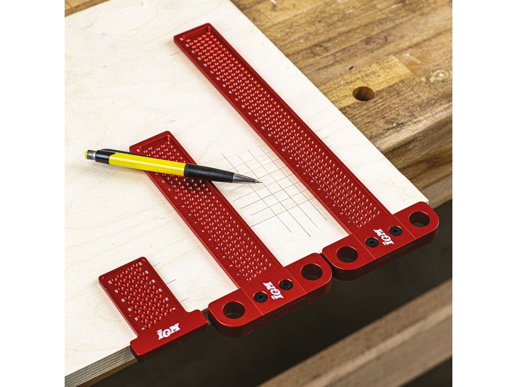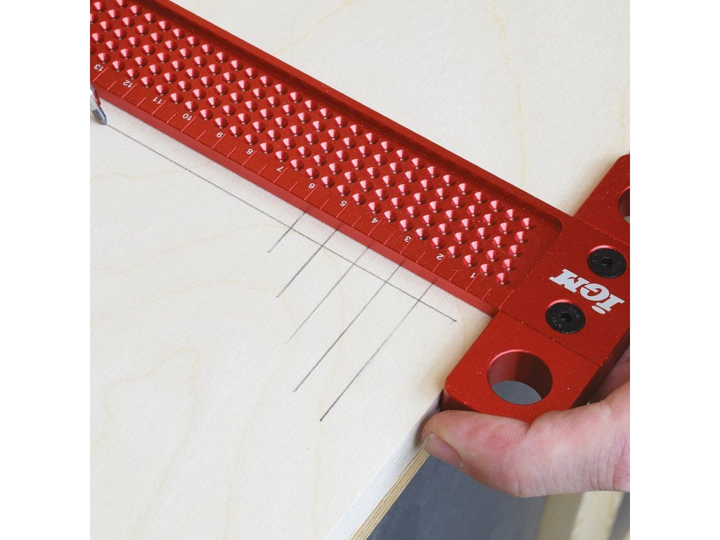 • Přesný duralový příložník.• Rychlé a přesné rýsování pravého úhlu.• Rychlé a přesné rýsování rovnoběžných čar s hranou dílce.• Značící otvory po 1 mm.• Jasně čitelná stupnice po 5 mm.Přesný a snadno použitelný duralový příložník se značícími otvory. Za pomoci příložníku vytvoříte dokonalé rovnoběžné čáry. Vložte tužku do odpovídajícího otvoru a vytvořte rovnoběžnou čáru posouváním příložníku po hraně dílce. Rovnoběžnou čáru můžete rýsovat ve vzdálenosti 5 až 160 nebo až 260 mm. Každý otvor představuje 1 mm.• Materiál ze slitiny hliníku je odolný proti opotřebení a korozi.• Příložník je vhodný pro tuhy 0,5–1 mm.• Dodává se ve dvou variantách v délce stupnice 160mm (celková délka 200 mm) nebo 260 mm (celková délka 300 mm).• Rozměry:Varianta 160 mm - 200 x 98 x 14 mmVarianta 260 mm - 300 x 98 x 14 mm