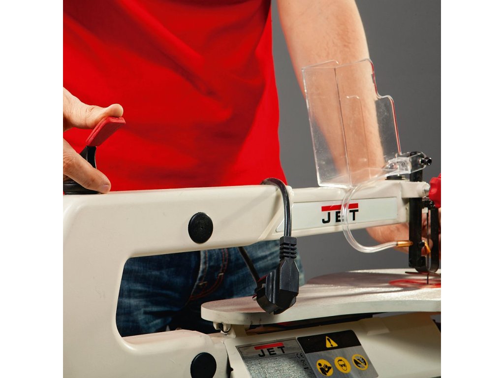 Elektrická lupínková pila nebo-li dekupírka JET je vybavena výkonným komutátorovým DC motorem s plynulou regulací kmitů (550-1.600 / min). Proto s ní lze snadno řezat širokou škálu materiálů až do tloušťky 50 mm. Průměr odsávací hubice pro připojení k odsavači je 35 mm. Velkorysý stůl (410 x 254 mm) s maximální šířkou řezu 510 mm je možné naklápět až na 45° pro úhlové řezání. Pila je dodávána s kolíkovým upínáním pilových listů. Uvolňovací ovládací kolo umožňuje rychlou a snadnou výměnu. Ventilátor pomáhá udržet místo řezu čisté a dobře viditelné. Díky těžké litinové základně je stroj stabilní a má minimální vibrace.