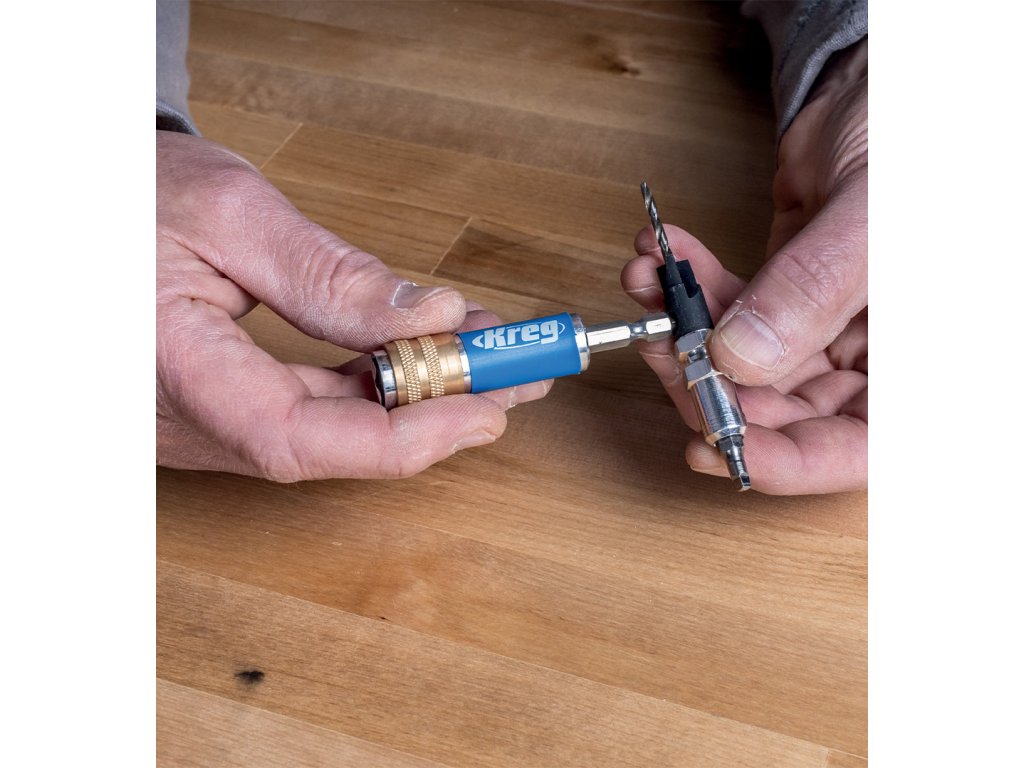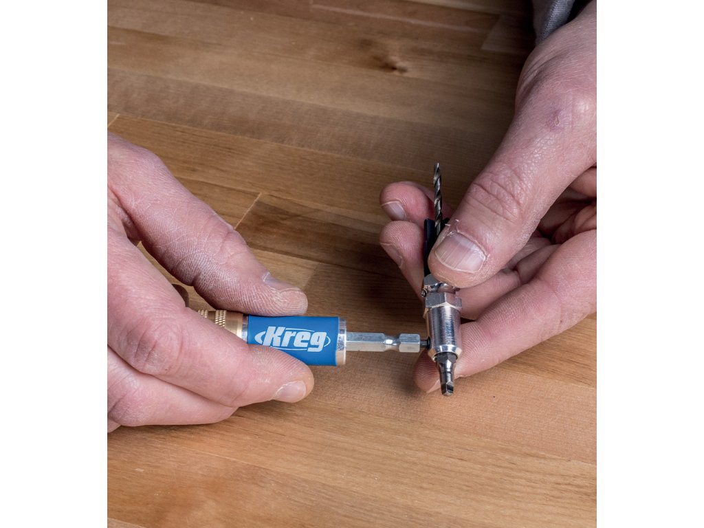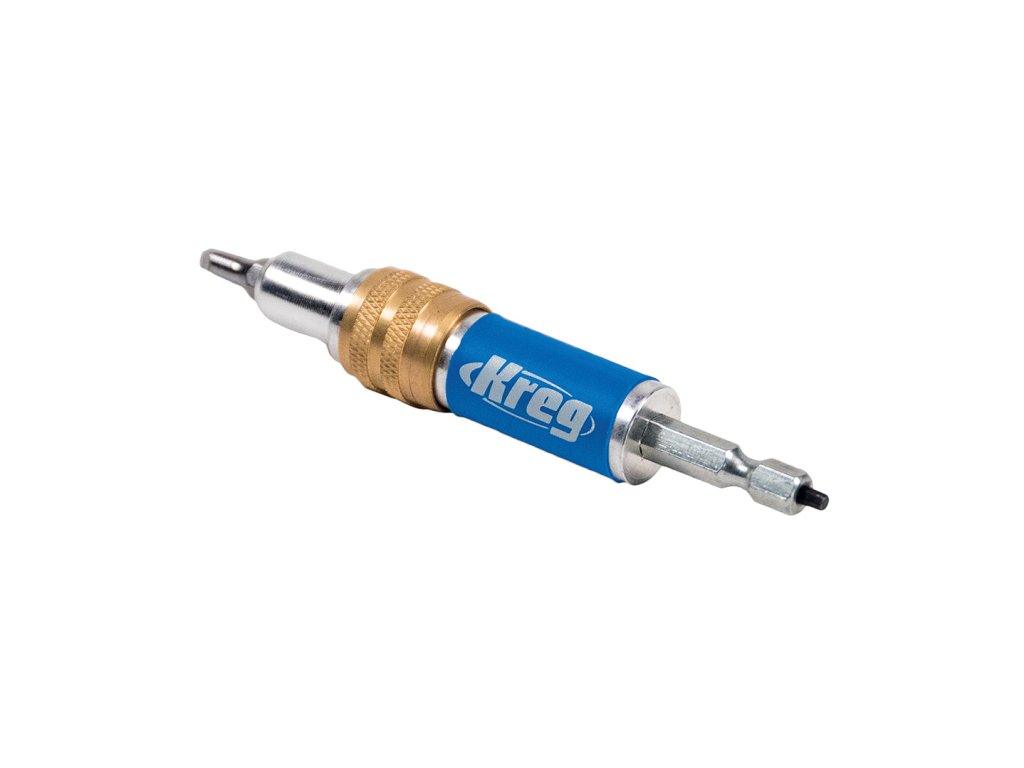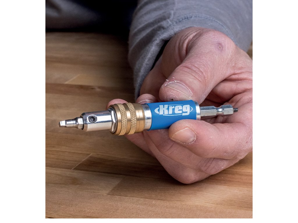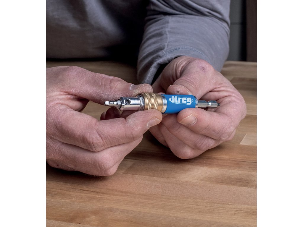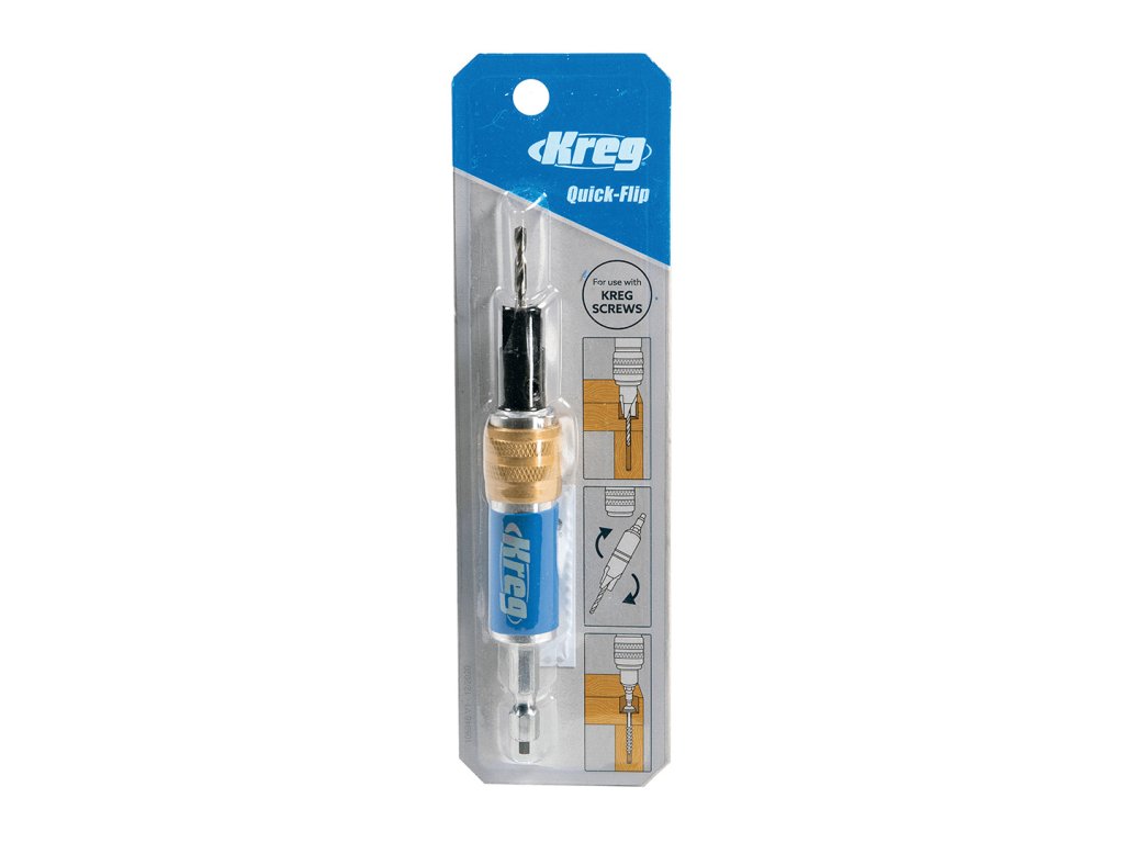 Kreg Nástavec Quick-Flip vyvrtá pevné spoje a zároveň zašroubuje Kreg Šrouby. Můžete tak rychleji vytvářet spoje za použití jednoho nástroje. Jedná se o oboustranný nástavec. Vrtákem na jedné straně si předvrtáte otvor, čtyřhranným bitem č. 2 pak zašroubujete šrouby. Tento nástavec je nepostradatelným nástrojem zejména pro Kreg Šrouby. Do předvrtaného otvoru přesně pasují Kreg Šrouby, hlava šroubu bude zapuštěná.