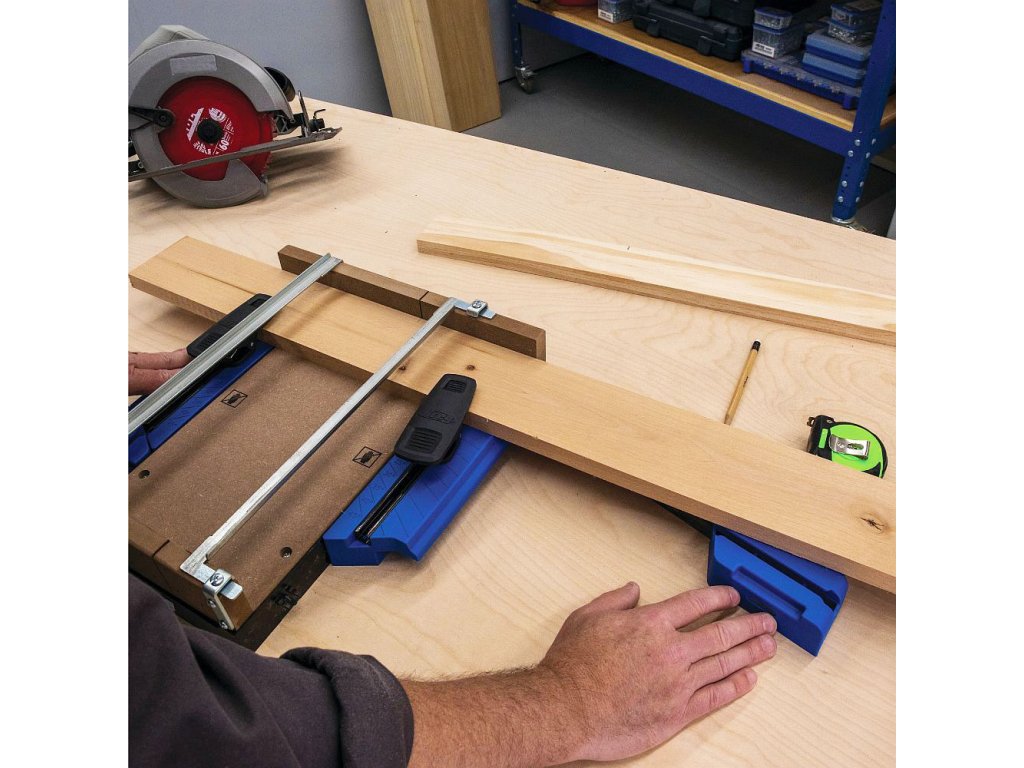 • Přípravek pro přesné příčné řezání ruční kotoučovou pilou.• Snadné a přesné příčné řezání s plnou kontrolou až do šířky obrobku 305 mm (při úhlu 90° k obrobku).• Snadné a přesné řezání na délku s plnou kontrolou až do šířky obrobku 89 mm (při úhlu 45° k obrobku).• Pokosové řezy od 0° až do 45°.• MDF základna a polohovací deska pro řezání bez otřepů na spodní straně obrobku.• Nastavovací MDF deska přesně ukazuje linii řezu.• Výklopné boční nástavce poskytují podporu pro dlouhé obrobky.• Nástavce lze odpojit od přípravku pro poskytnutí podpory i pro velmi dlouhé obrobky.• Kompaktní design pro rychlou dostupnost a snadné skladování.• Úhlová stupnice na přípravku pro rychlé nastavení nejběžnějších úhlů řezu.• Praktické upínací čelisti drží řezaný materiál bezpečně na místě.• Pro ruční kotoučové pily s pilovým kotoučem D 140 - 184 mm.• Funguje s pravostrannými i levostrannými okružními pilami.S tímto přenosným pomocníkem a vaší ruční okružní pilou vytvoříte během okamžiku plnohodnotnou úhlovou a pokosovou stanici.POZNÁMKA - Nevhodné pro ponorné pily, protože jejich pilový kotouč zařezává do opěrného vodícího profilu.• Maximální zpracovávané materiály (Š x V): 305 x 38 mm• Hmotnost: 3,62 kgObsah balení:• 1x KREG Pokosový řezací přípravek pro okružní pily