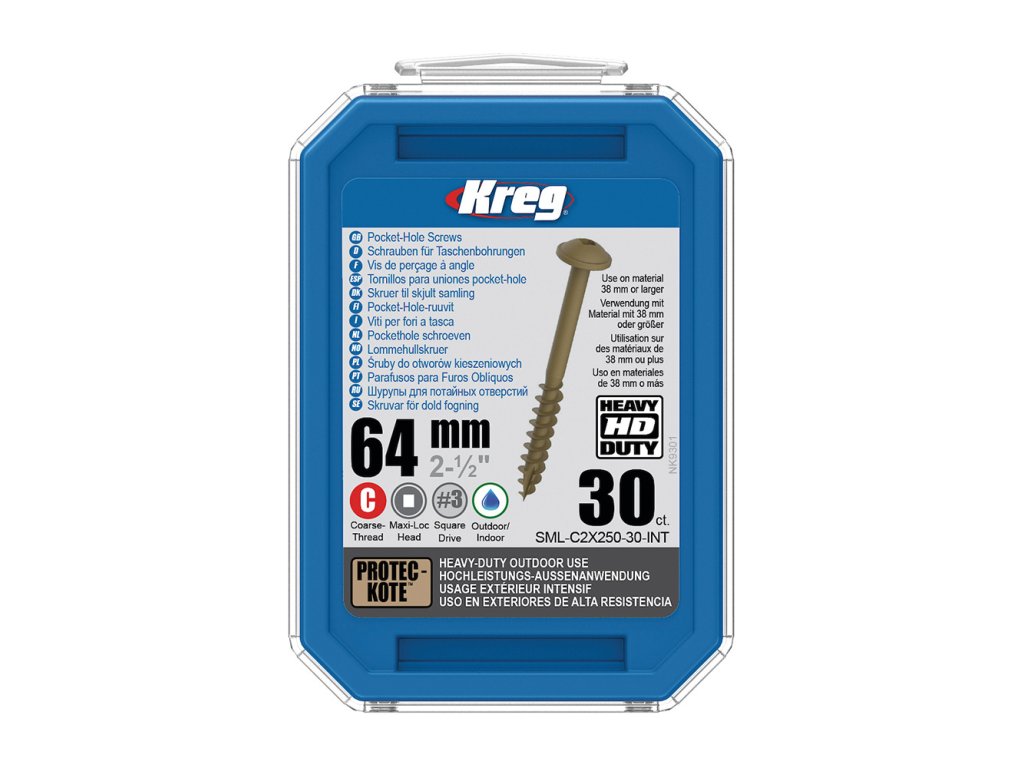 Kreg HD Šrouby jsou dělané pro použití s Kreg Svrtávacím přípravkem HD. Dlouhé 64 mm šrouby z tvrzené oceli jsou velmi odolné. Mají třívrstvou povrchovou úpravou Protec-Kote pro maximální odolnost proti korozi.