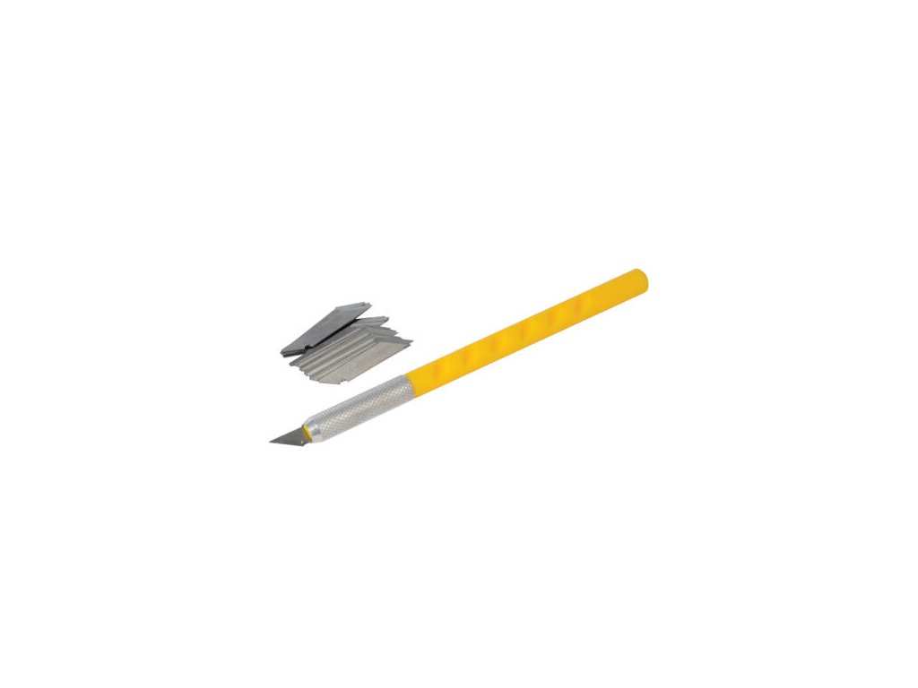 Modelářský skalpel s plastovou rukojetí se zářezy a vroubkovanou mosaznou převlečnou maticí, kterou zajistíte vsazenou čepel. Součástí balení je 25ks nových čepelí v praktické krabičce kde je i „odpadní“ box pro otupené čepele. Ostří je chráněno plastovým víčkem. Celková délka skalpelu 150mm