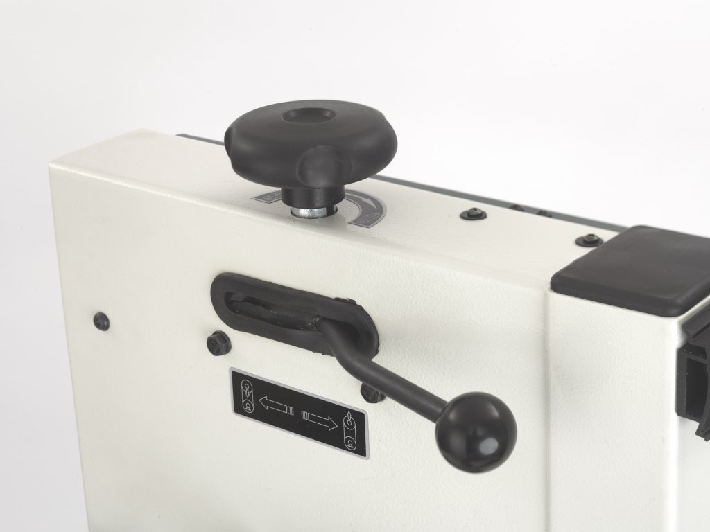 Silný napínací systém, který se obvykle nachází pouze na větších strojích, je vybaven vačkovým mechanismem, který umožňuje rychlou a snadnou výměnu pilového pásu.