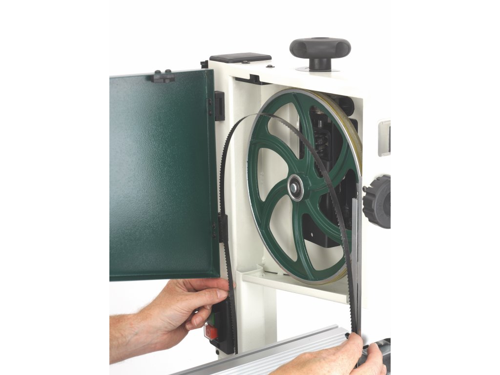 I když je pásová pila umístěna proti stěně dílny, ofsetové panty Vám umožní, aby se dveře otevřely dostatečně daleko a umožnily tak dobrý přístup při výměně pilového pásu, aniž by bylo nutné dveře vyjmout nebo pohybovat pásovou pilou od zdi.
