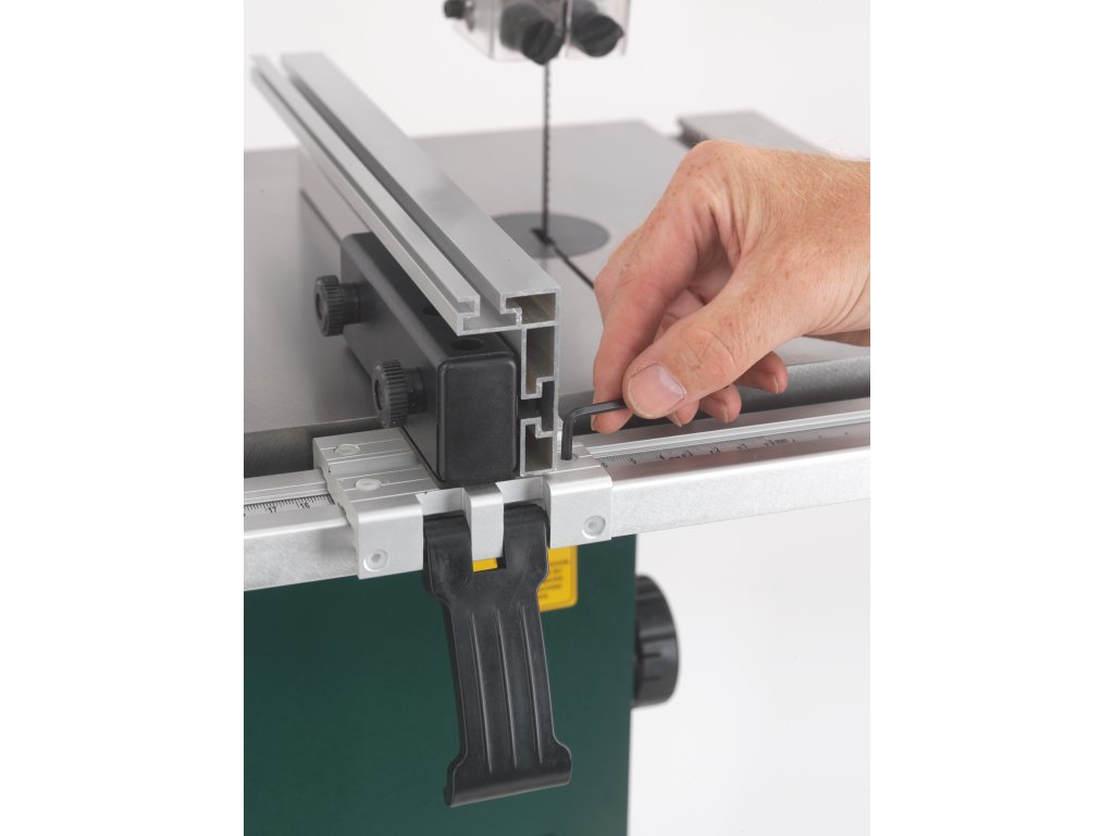 Konstrukce držáku pravítka umožňuje umístit hlinikový profil na levou i pravou stranu od pilového pásu, přičemž je hliníkový profil zajištěn na opačné straně držáku. To je ideální pro podporu dřeva při řezání stolu např. pod úhlem.